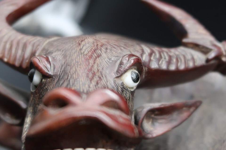 Beautifully carved statue and stand, with several repairs from previous owners over its long life. All pictured. Nice carved eyes and teeth. Wear and imperfections consistent with age and being handled. Please carefully examine all pictures before purchasing. The pictures are an important part of the description, and usually include important measurements. Items are in good pre-owned condition unless otherwise noted.