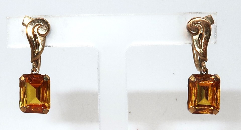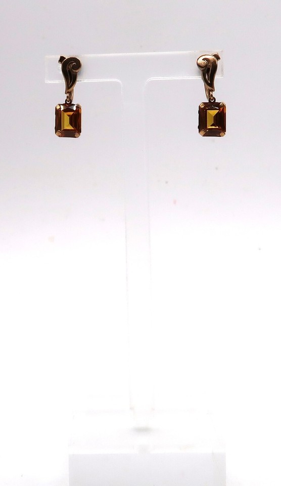 Vtg Faux Topaz or Citrine Emerald Cut Screw Back Gold Tone Earrings Stunning