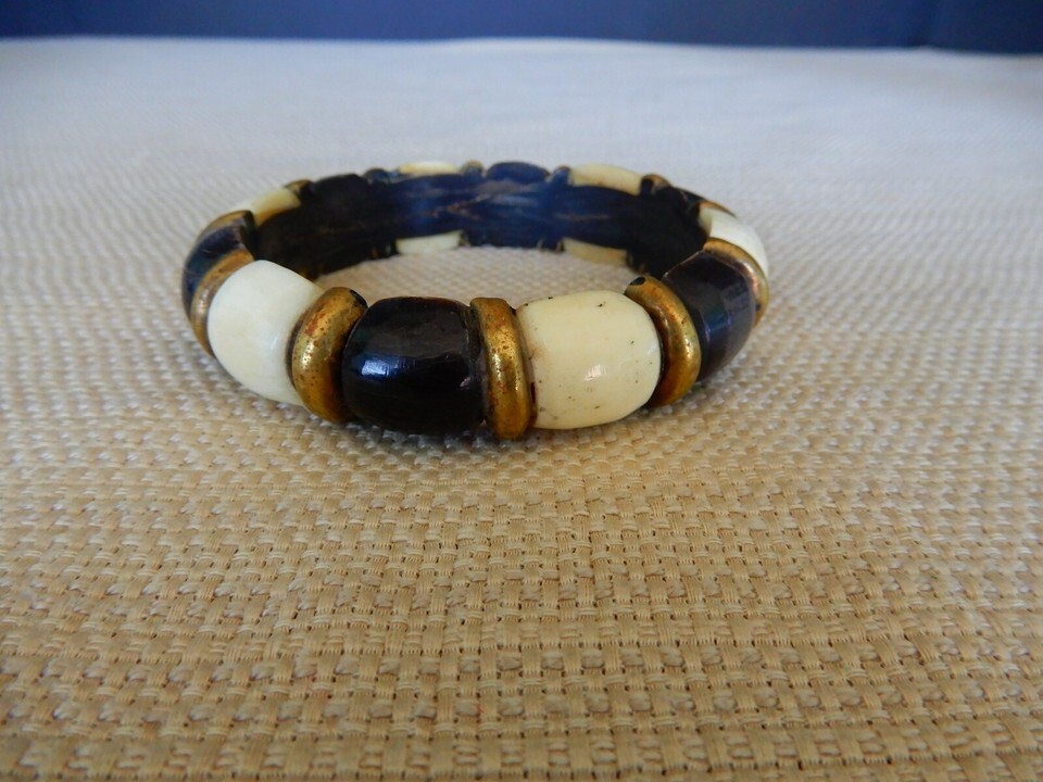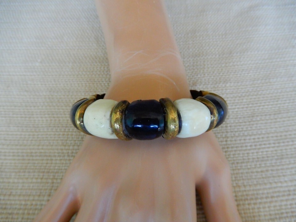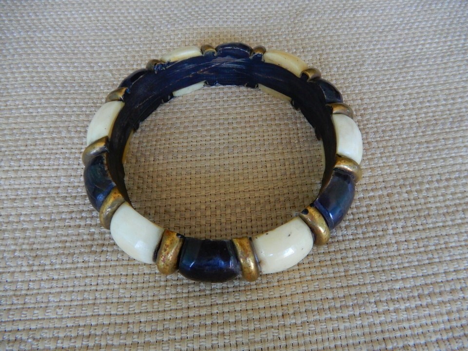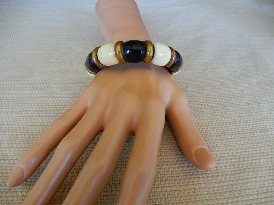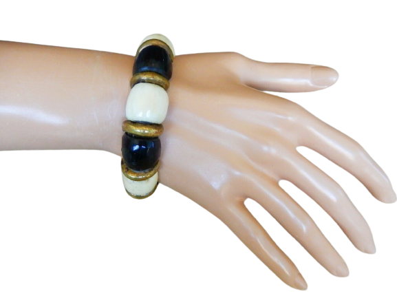 Vintage black, white, & gold tone faux bead bangle bracelet