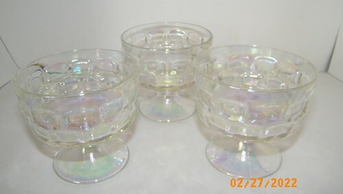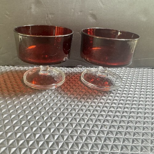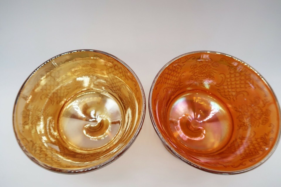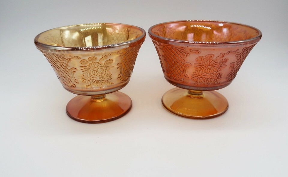 Pair of vintage marigold carnival glass footed pedestal dessert cups bowls