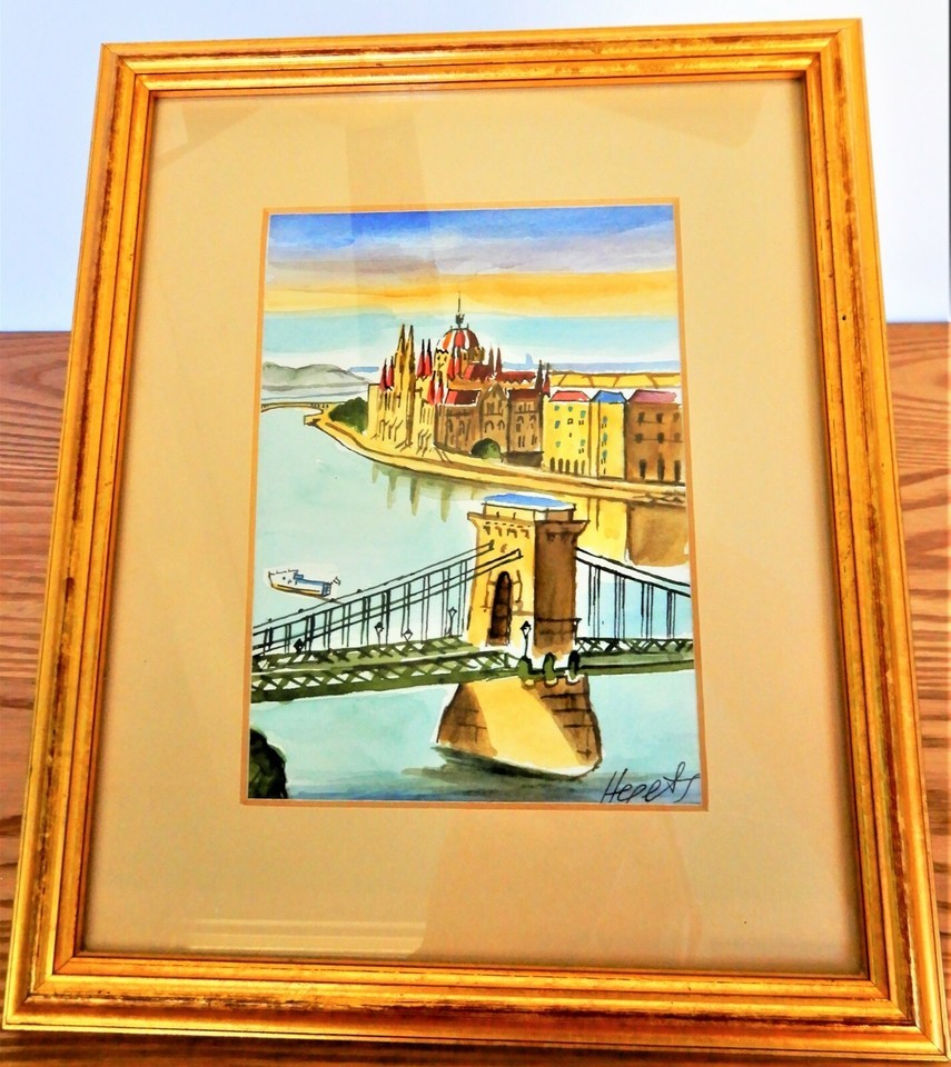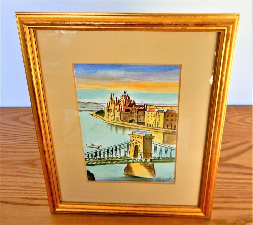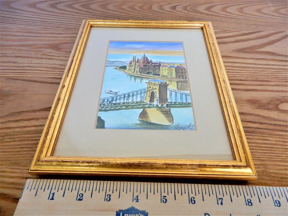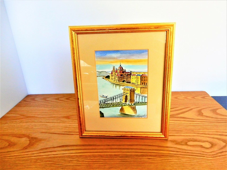 Vintage Watercolor Print City Bridge Scape Signed by Artist Framed and Matted