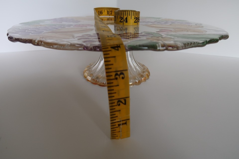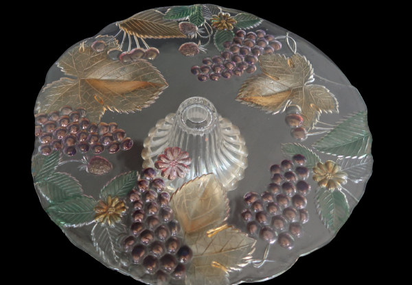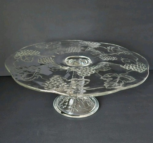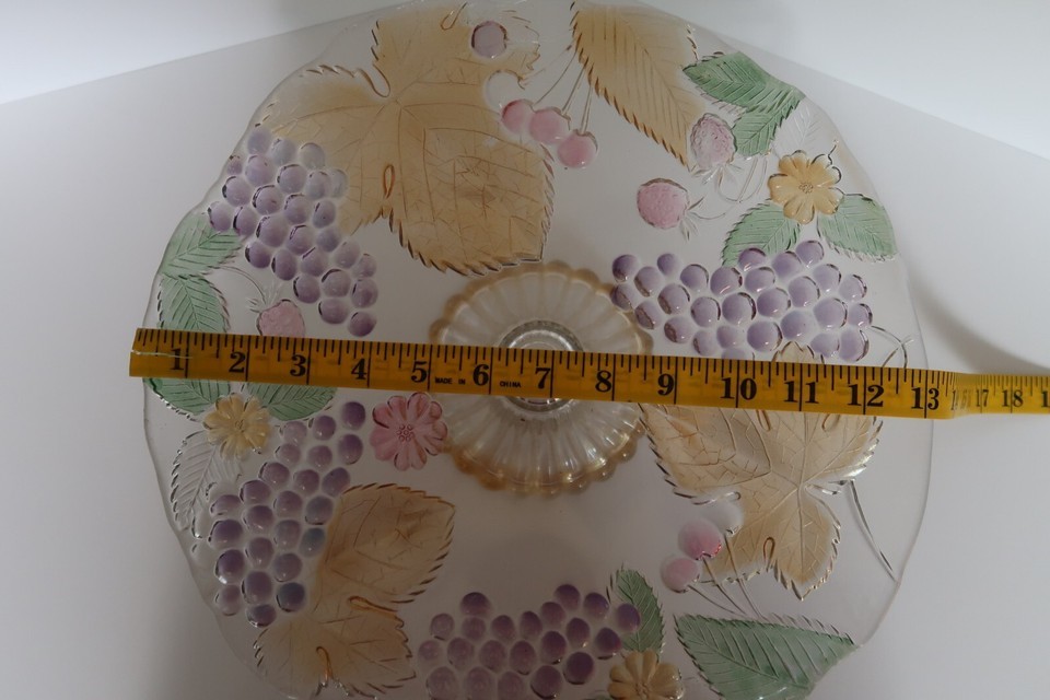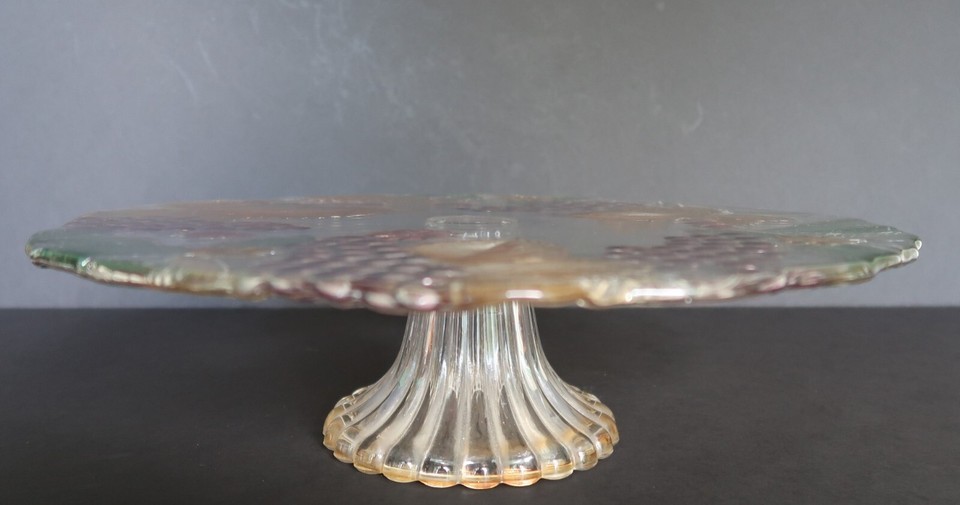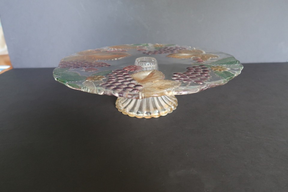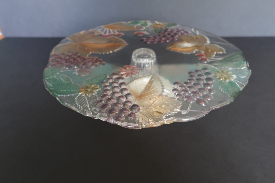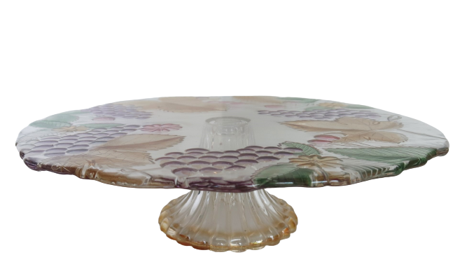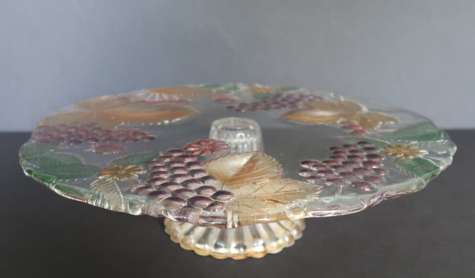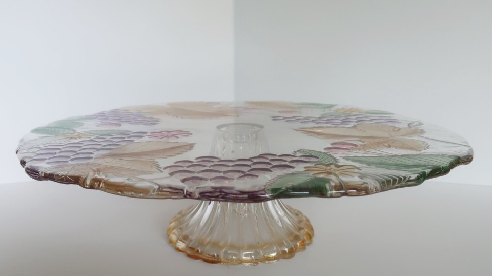 Vtg glass cake tray stand clear with multi color grapes, leaves & flowers design