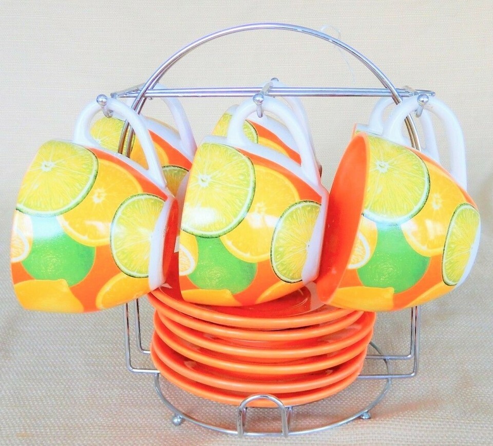 Opalina 6 cup & saucer set w/ chrome caddy in citrus fruit pattern