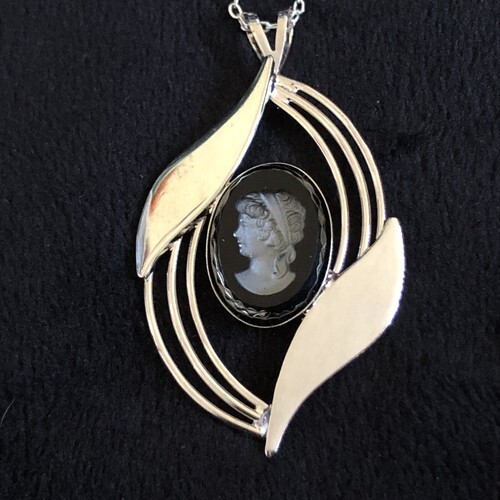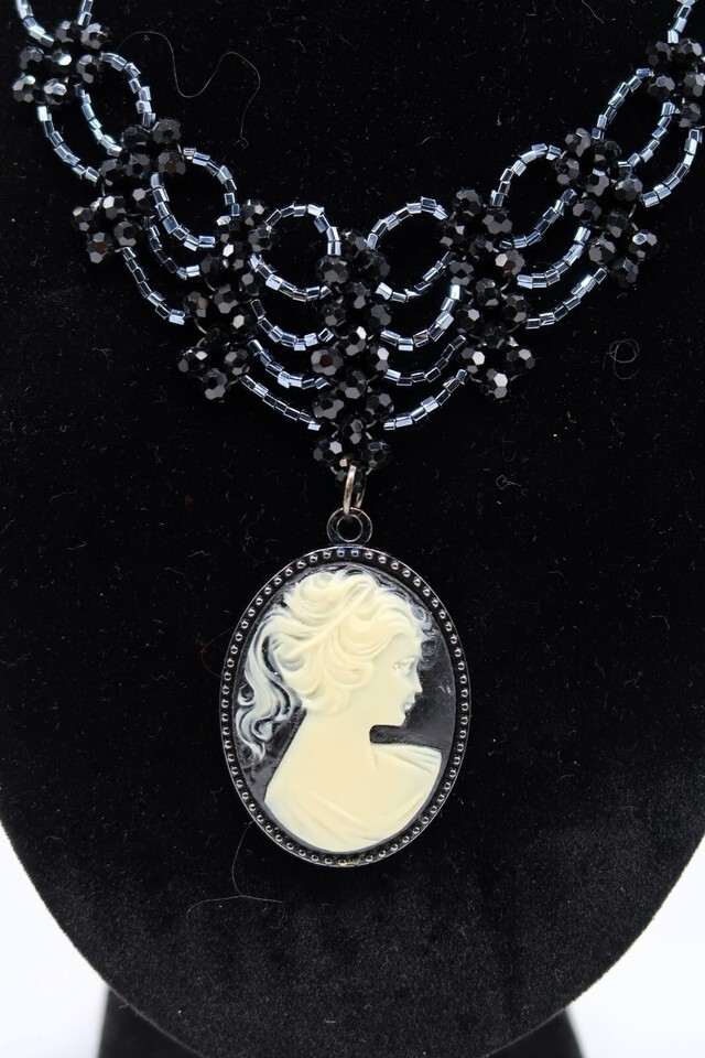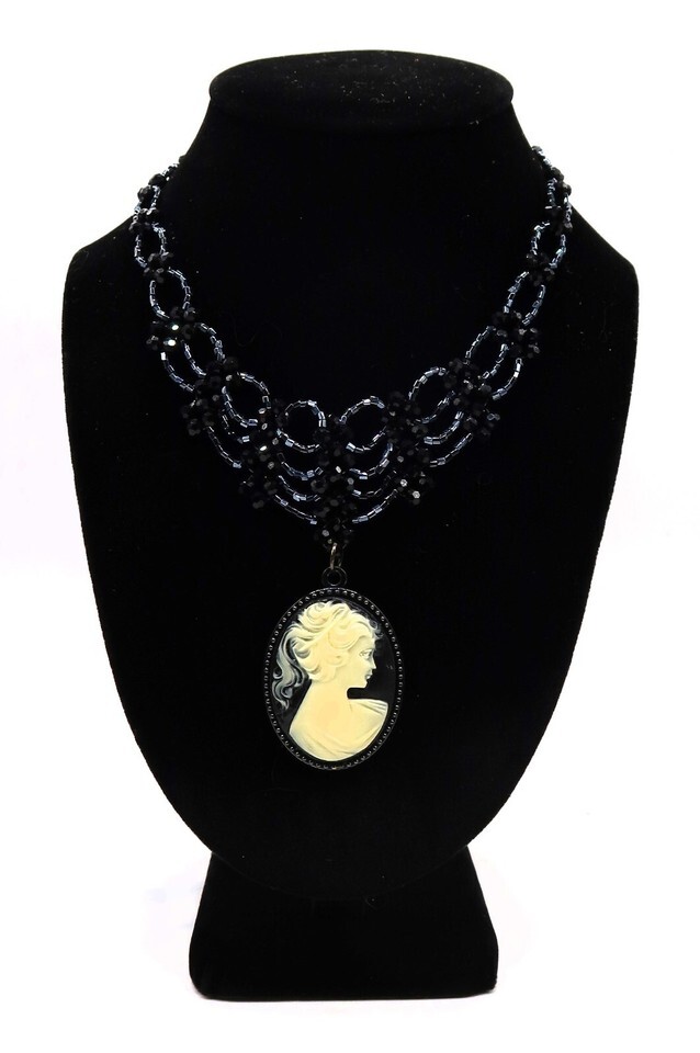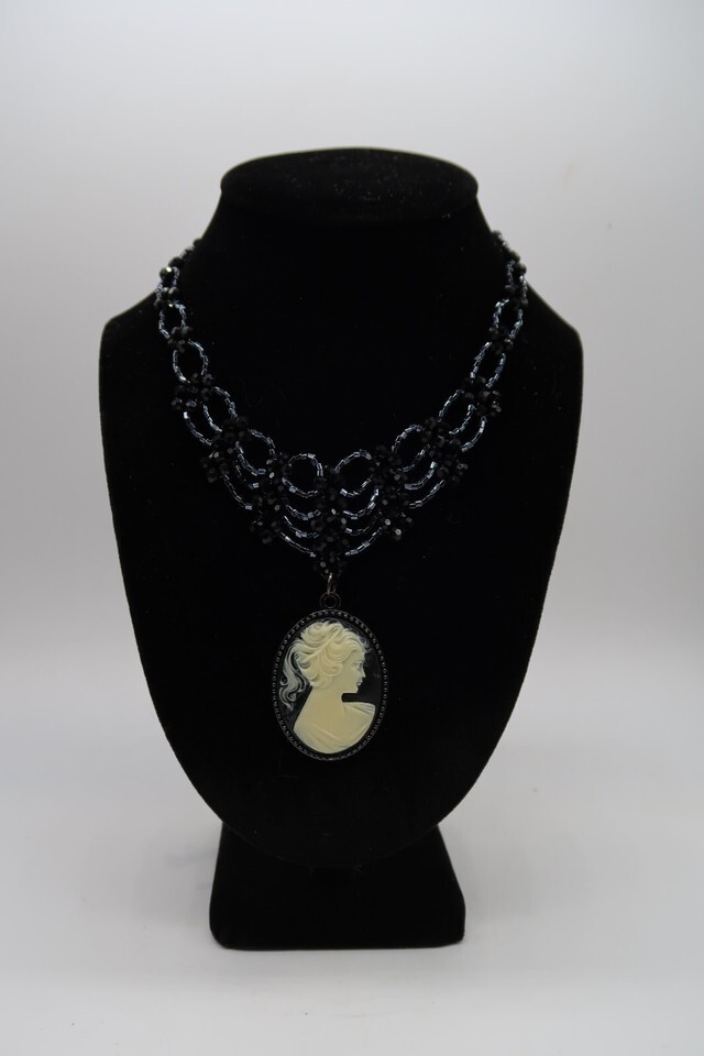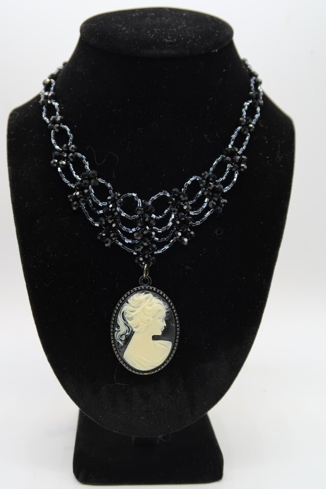 Vtg Princess Length Bib Necklace Black Rhinestone Cameo Sillouette Pendent