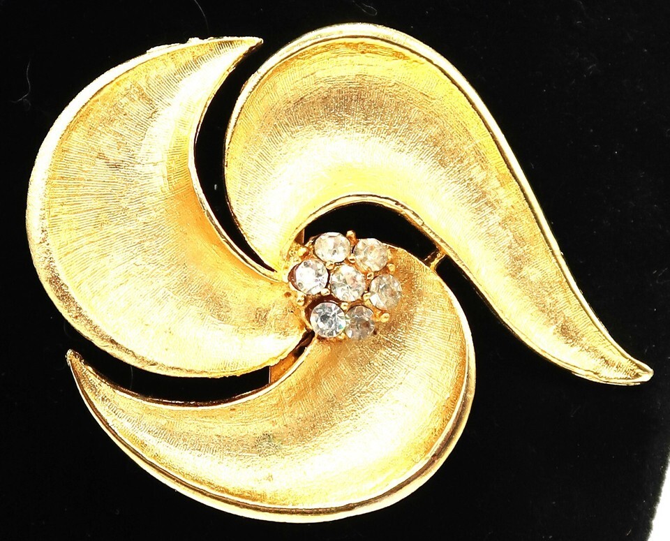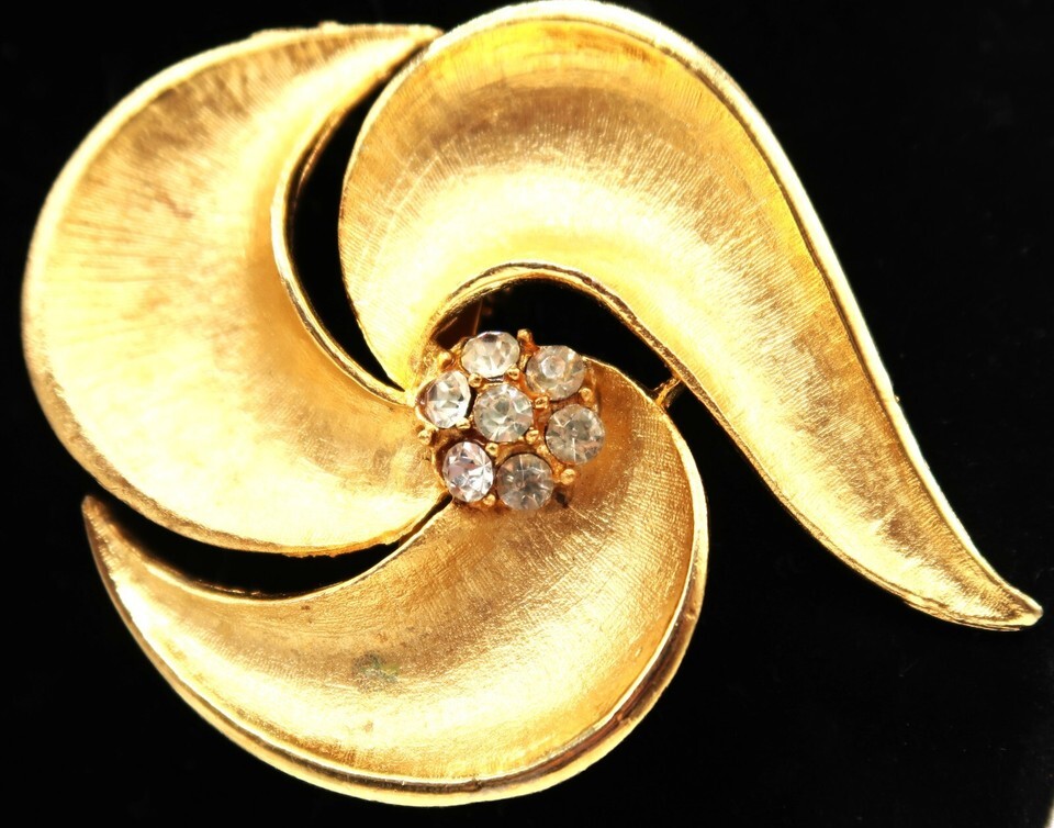 Vtg Gold Tone Abstract Swirl Fan Flower Brooch W/ Prong Set Accent Rhinestones