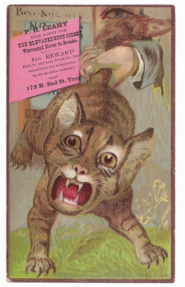 Circa 1890 P.H. Leahy Troy NY trade card cat having its tail pulled