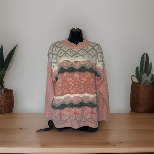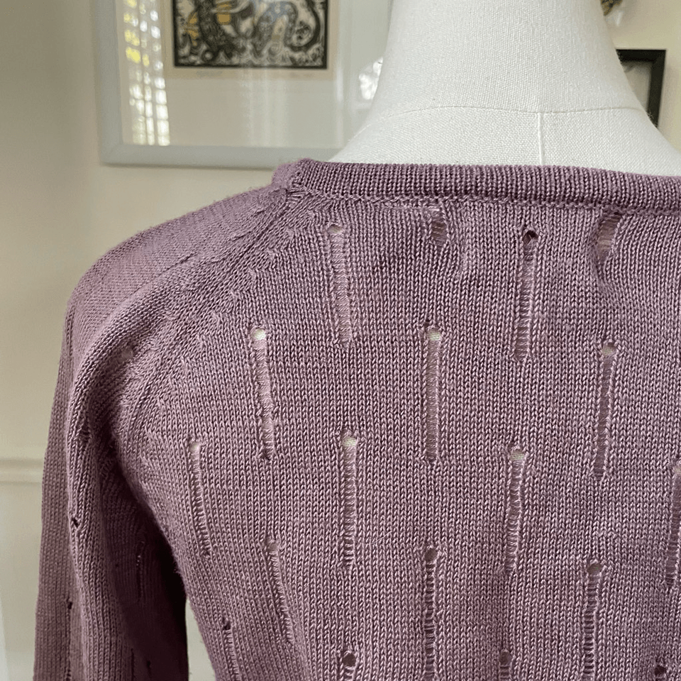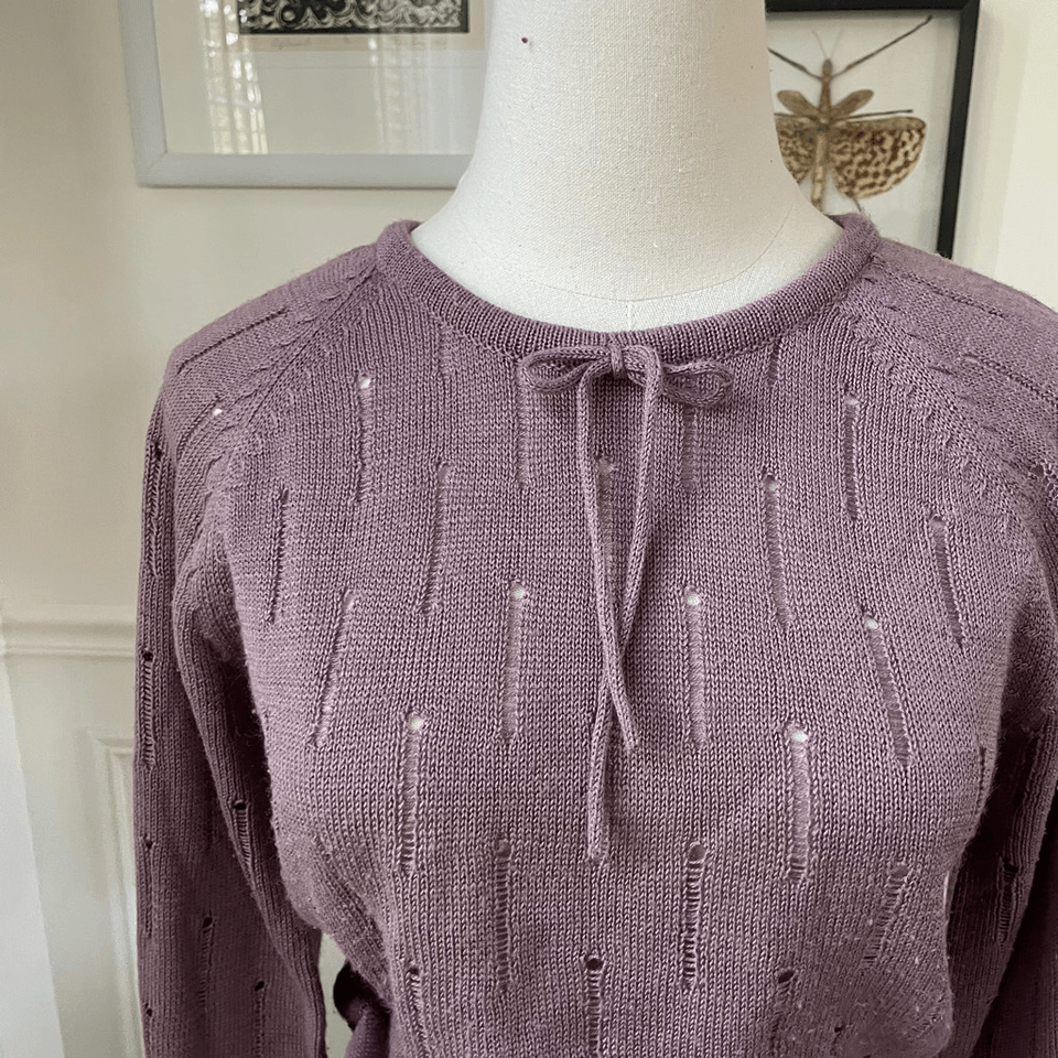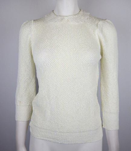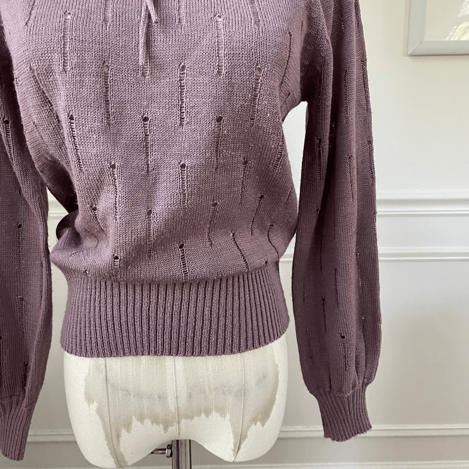 Late 70s Foxmoor mauve purple (is there such a thing?) blouson style Pointelle sweater with slightly full sleeves before gathering at the wrist and wideband ribbed hem. Round neck and small bow. 100% acrylic. Laying flat measures 22 inches shoulder to ham, 17 inches armpit to armpit and 11.5 inches across the waist. Made in Taiwan ROC. the knit has some stretch. Based on these measurements, I am listing this as a modern XS. The tag size is medium, but vintage sizing varies from modern so please double check measurements to ensure the proper fit for you.