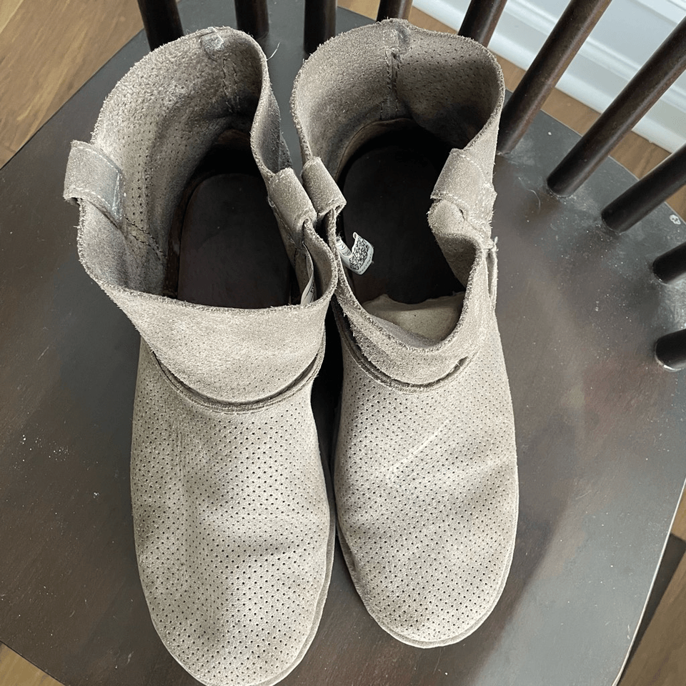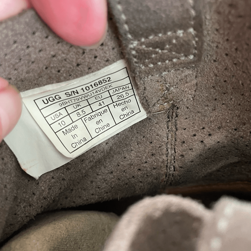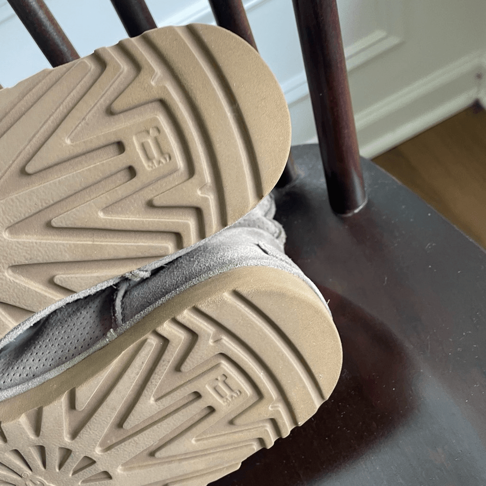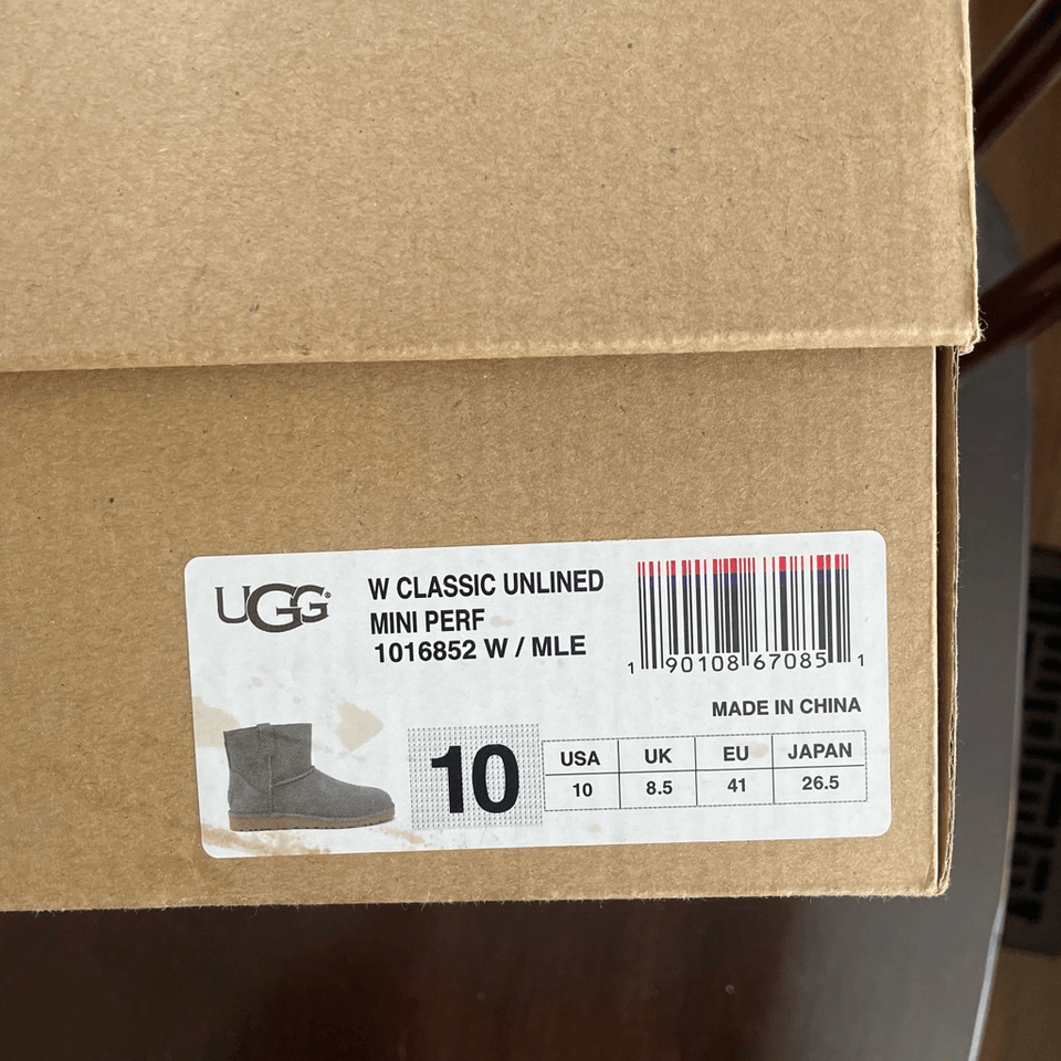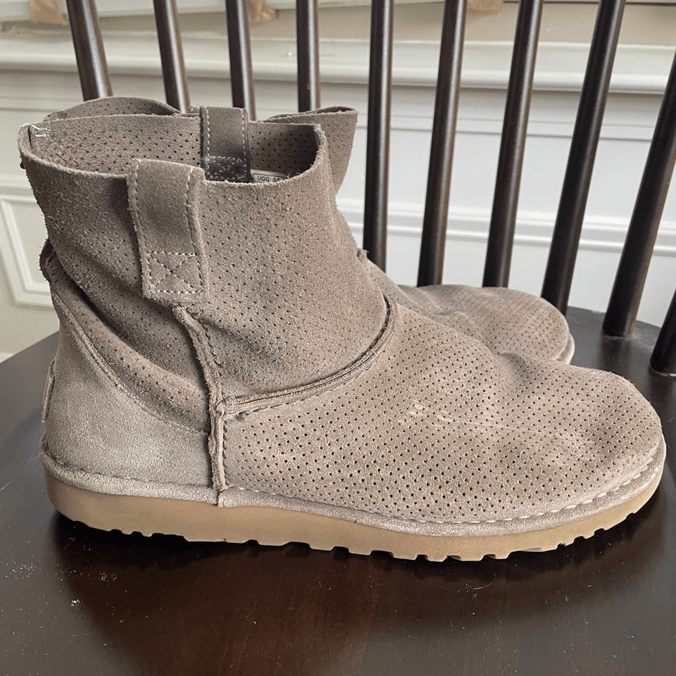 Ugg Women's Classic Unlined Mini Perf Boots in mole, which is a true taupe color that is across between beige and gray. Ugg Women's Classic Unlined Mini Perf Boots are a luxe update to the Classic Mini, crafted from soft suede and left unlined for a lightweight feel. They feature an innovative Treadlite by UGG sole for lightweight traction on any surface. These boots are ankle height. Reviews note that they are comfy and cute, and make a great fashion statement. Come with the box and even the purchase receipt from Macy?s. Lots of life left to the tread, I really don?t see much wear at all.