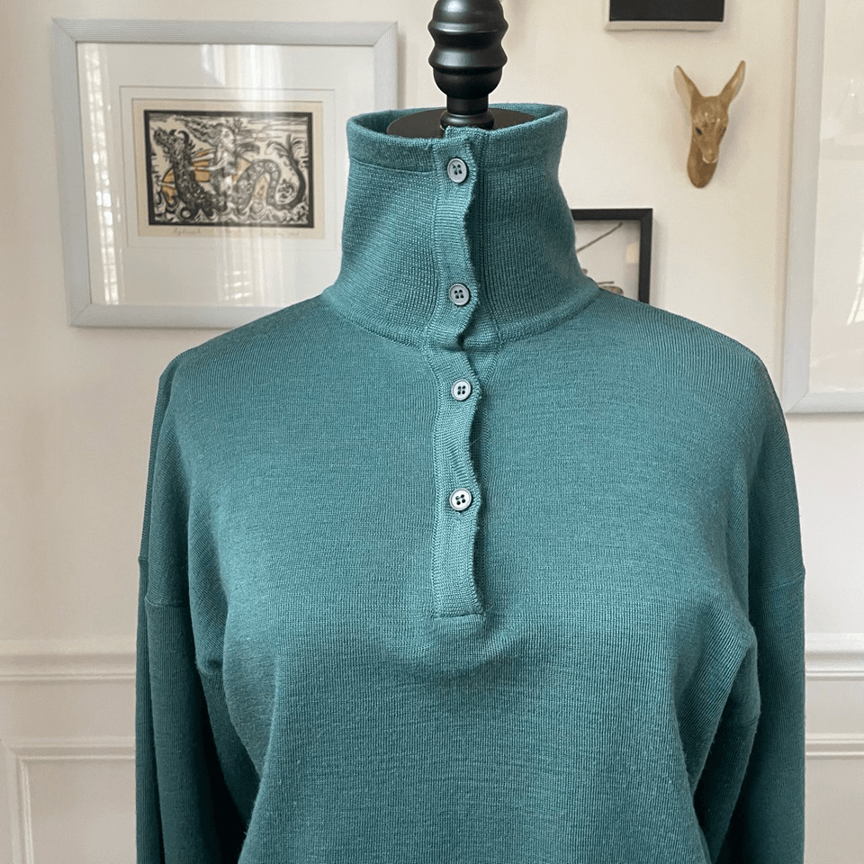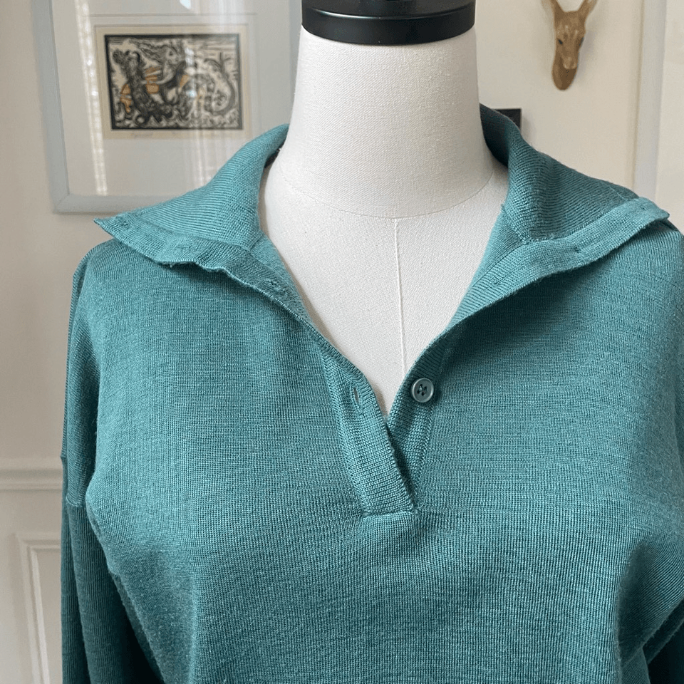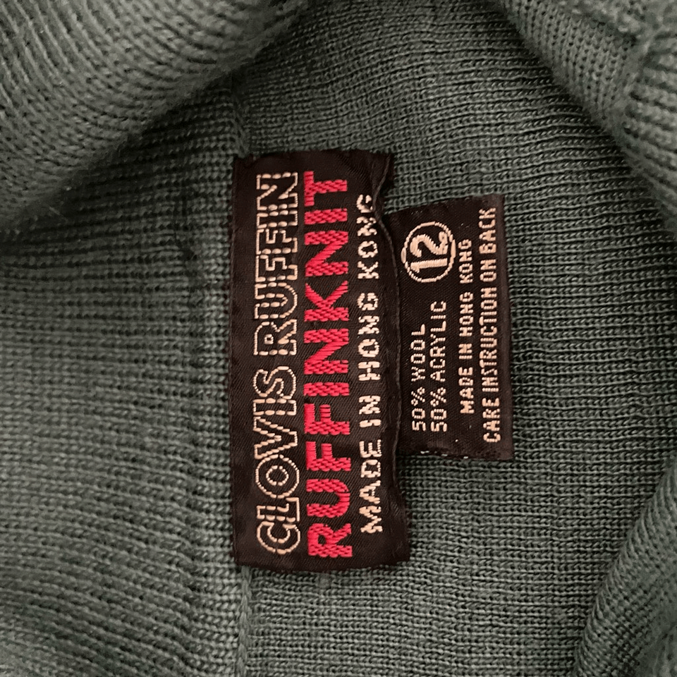 Vintage 70s Clovis Ruffin Ruffinknit green wool and acrylic blend slightly cropped sweater with a neckline that can be worn open sailor style or be buttoned up and worn as a turtleneck. 21 inches shoulder to hem with an adjustable Drawstring Waist, and 19 inches armpit to armpit. Tag size 12 but more like a modern medium. No holes or stains. This brand really holds its quality and value. Very Jamie Lee Curtis/Halloween/going to babysit kind of sweater.