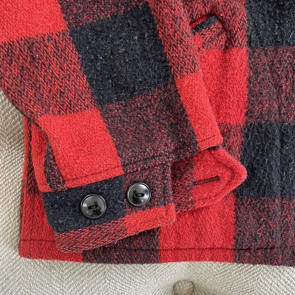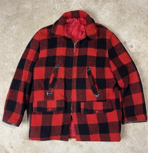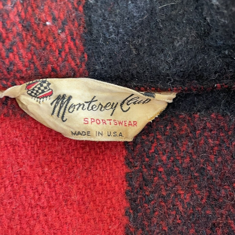 Mens vintage Monterey club sportswear red and black buffalo plaid wool full zip coat. Union label. Appears to be from the early 50s. Pockets. Talon zipper. Laying flat measures 25 inches shoulder to hem and 22 inches from armpit to armpit. There is no size tag but I estimate this is roughly a men?s size large. Please double check measurements to ensure the proper fit for you