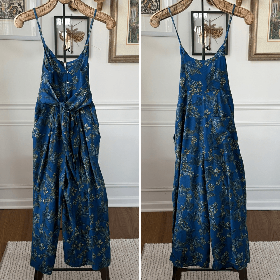 Incredibly light, spaghetti straps, cropped capri-length wide-leg pants with a flattering waist tie to cinch where you want it to. Dropped armholes. Low cut back. Twin hip pockets and one in the back for convenience! Pattern is a beautiful watercolor-esque floral, perfect for summer or a tropical vacation.