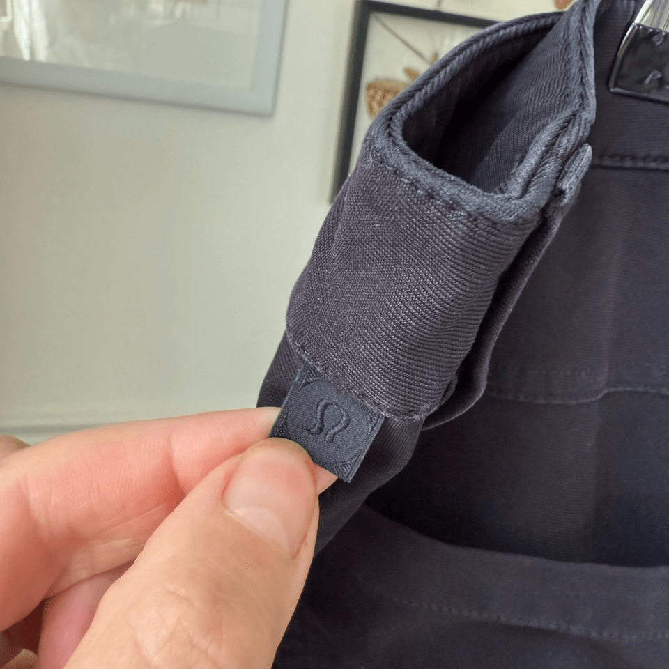 Lululemon ABC Pant, Classic fit in melanite which looks pretty much like black to me. Traditional five pocket styling with straight leg and button and zip closure. Brand tag at back hip. Size. in back pocket. These were supposed to be 34 inches inseam however it measures at 33 inches. This seems to happen a lot.