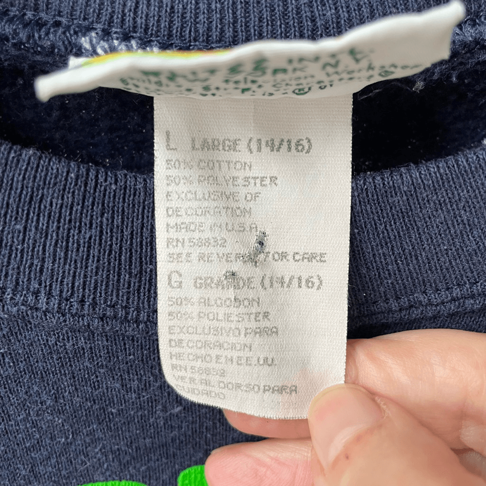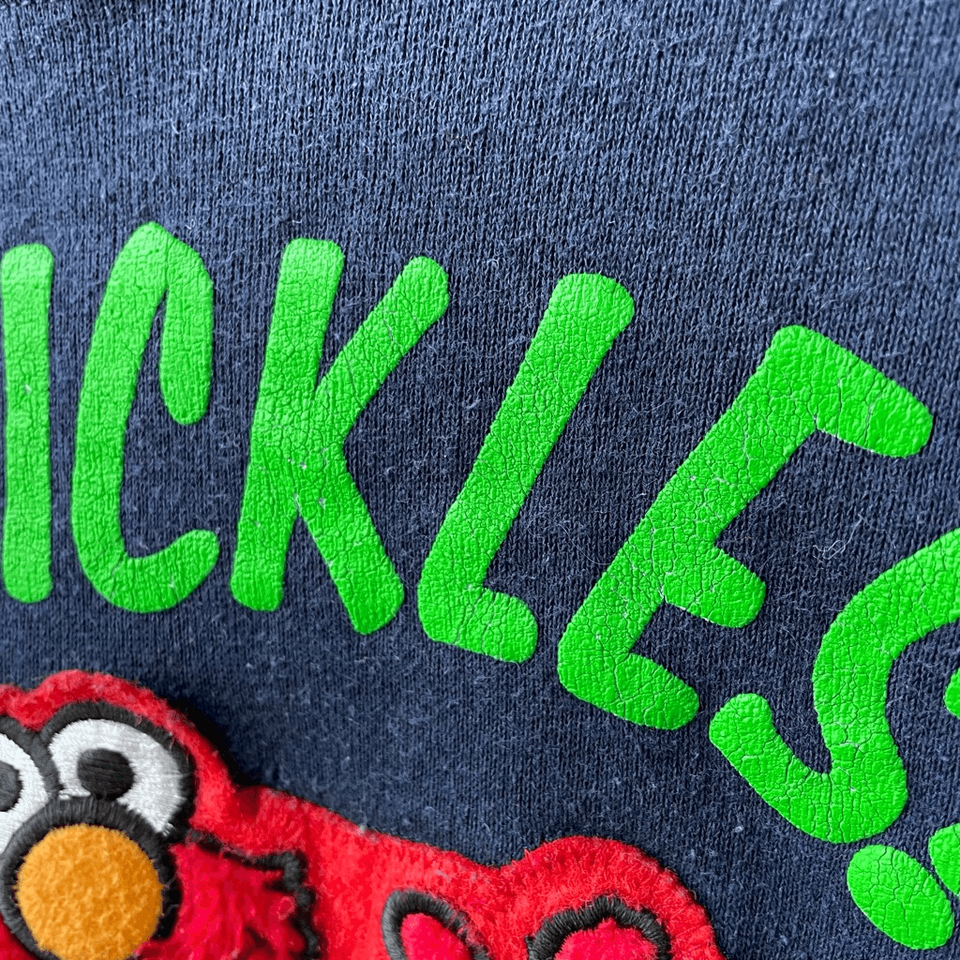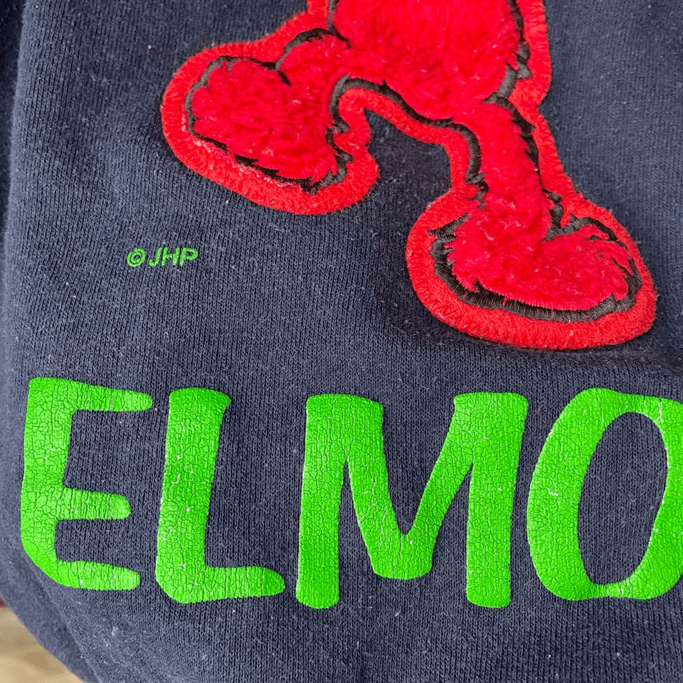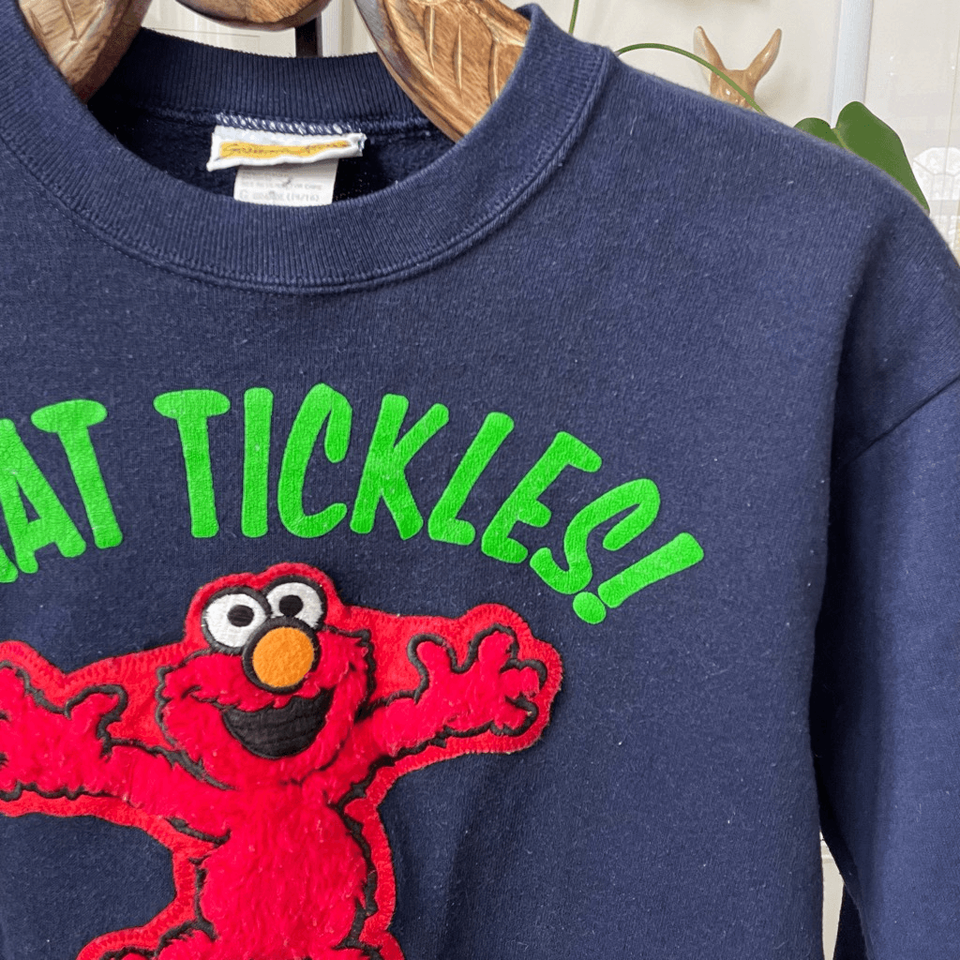Vintage 90s Sesame Street Tickle Me Elmo youth large 14/16 dark blue crewneck sweatshirt featuring a fuzzy red applique Elmo, and ?that tickles! Elmo? printed in green. Cotton and polyester blend made in the USA by blitzz international New York for children?s television workshop Sesame Street. Lane flat measures 19.25 inches from armpit to armpit and 20.5 inches shoulder to hem. Based on measurements, I would think this would also fit a women?s size small at a cropped length. The sleeves are 18 inches from shoulder seem to cuff. No stains or holes.