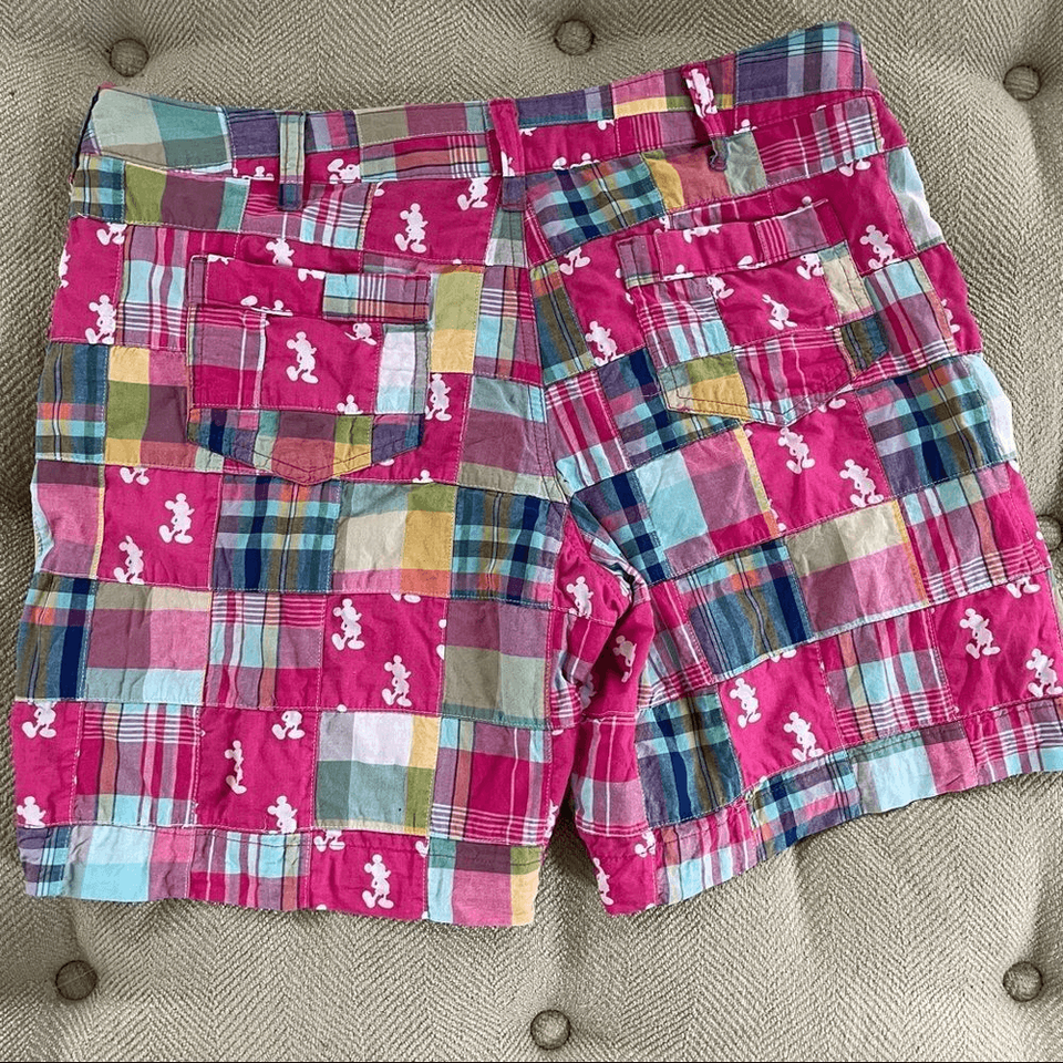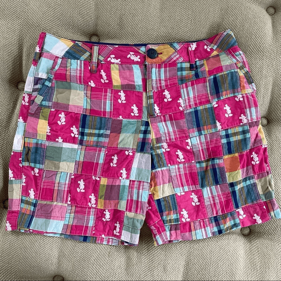 Walt Disney World Mickey Mouse Madras shorts with squares in plaid and Mickey Mouse print. Zip and logo button closure. Hip pockets and 2 back welt pockets. Laying flat measures 16.5 inches straight across the waist with a 7.5 inch inseam and 10.75 inch rise.