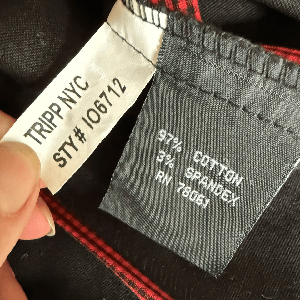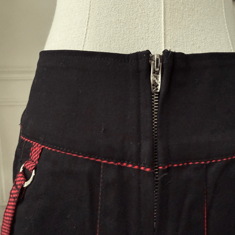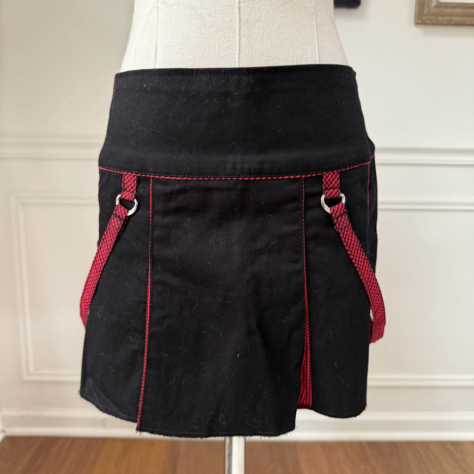 Vi rage Tripp NYC black pleated, micro mini skirt with red and black micro check accents and complete insets. Decorative loops at each hip also have the check pattern and the Silvertone D rings are stamped with branding, and there is a brand tab near the front hem. Exposed back silver tone exposed zipper with branded zipper pull. Tag size extra small and measures approximately 12 inches long, 13 inches across the waist and 17.5 inches across the hip. This is a hard to find item. Goth punk vampire