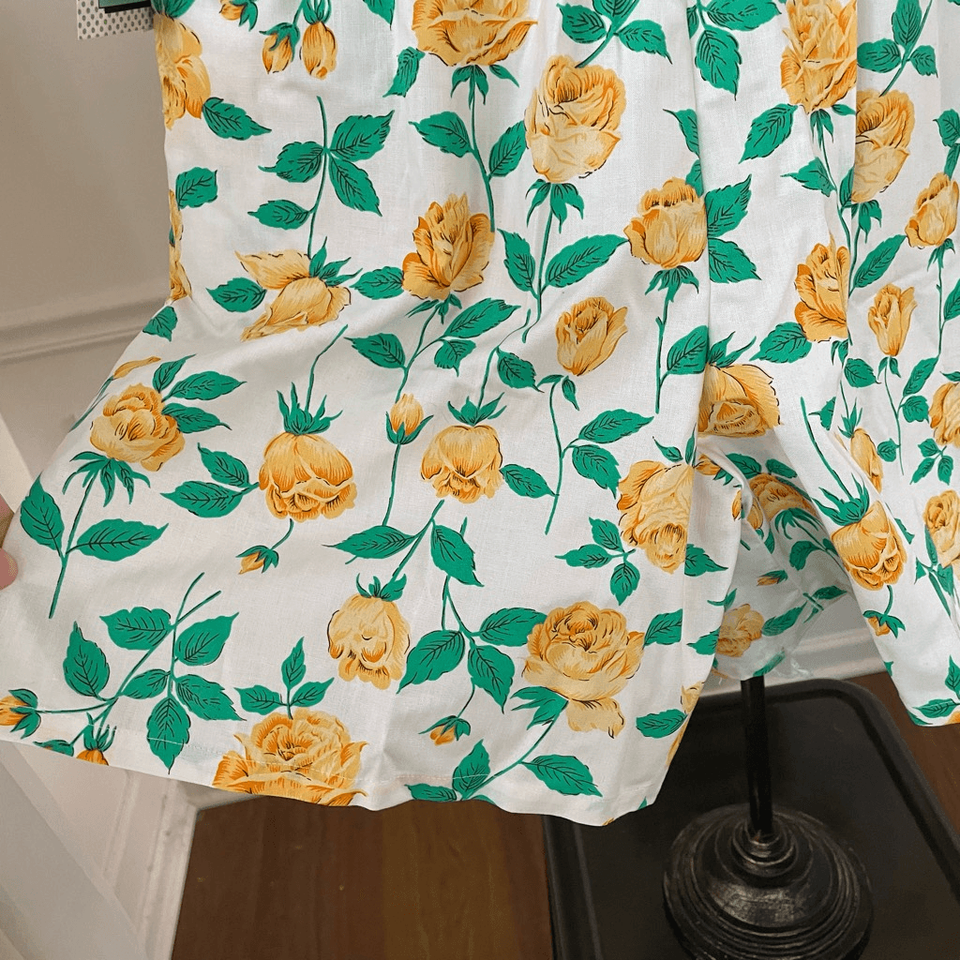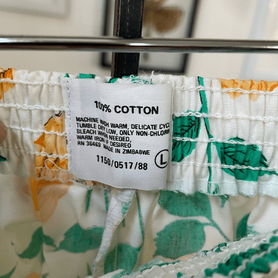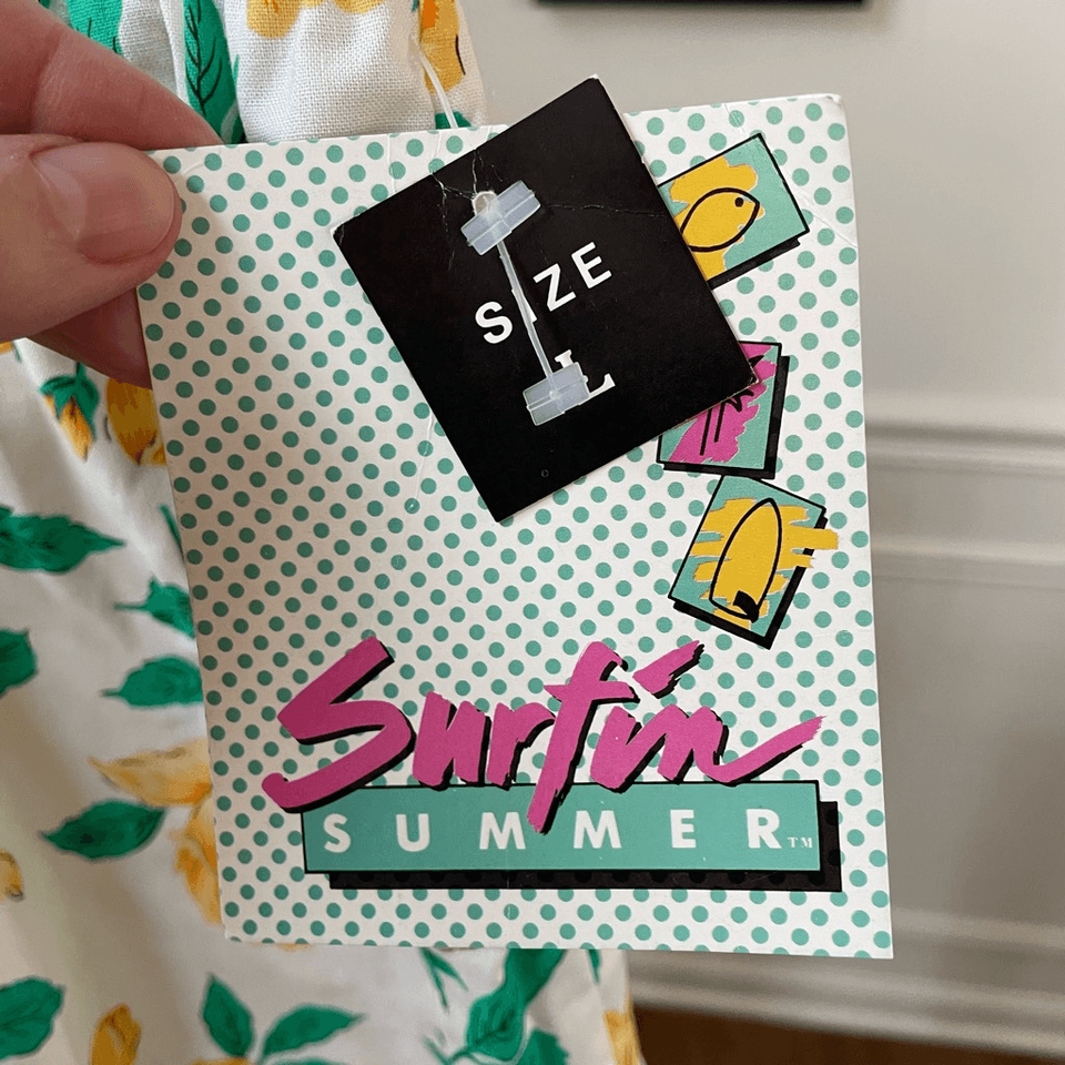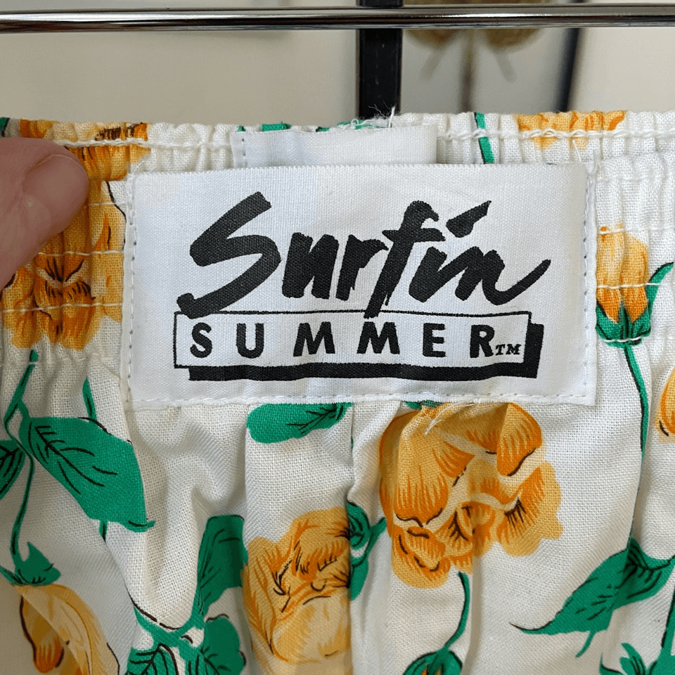 New old stock with tags, 80s Surfin Summer women?s pull on board shorts with all over yellow rose print. Even the tags on this thing are ionically 80s with the font and print. Made in Zimbabwe. 100% cotton. No noted flaws. Tag size large. Laying flat the waist measures 13 inches straight across when relaxed stretching to 16 inches without much resistance. 14 inch rise and 6 inch inseam. Please note vintage sizing is not quite like modern sizing, so please double check measurements to ensure the proper fit for you. To me these fit closer to a modern size medium.