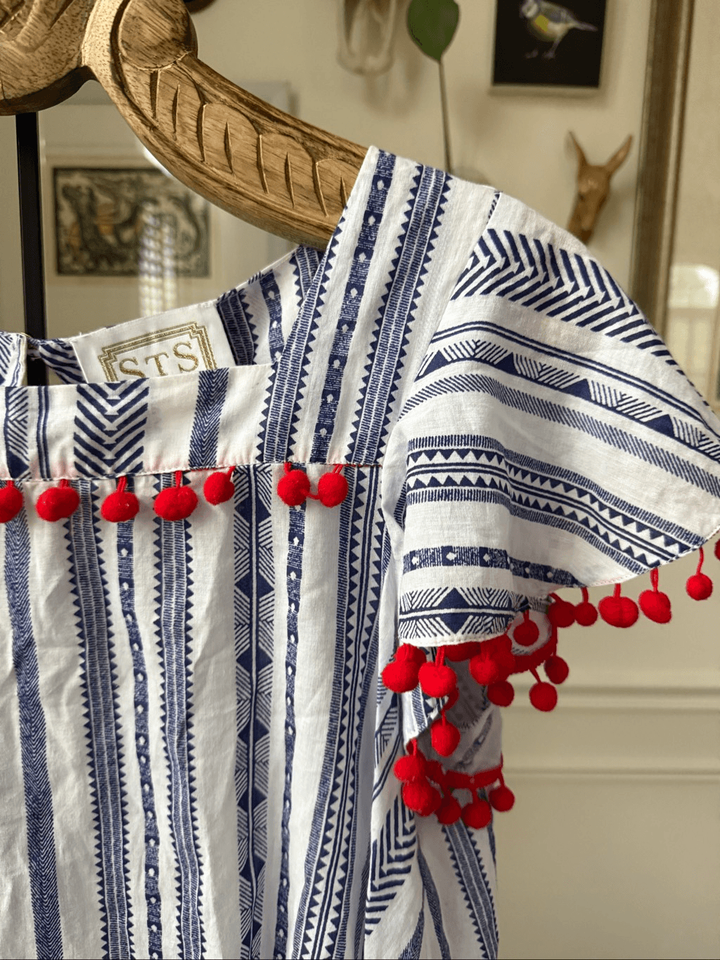 Sts Sail To Sable X Tuckernuck swing popover in lightweight sprinkle cotton with red pom-pom trim, and flounce sleeves. Back button keyhole closure. Blue and White stripe. Laying flat measures 23 inches shoulder to hem and 19 inches armpit to armpit. Preppy coastal beachy boho