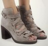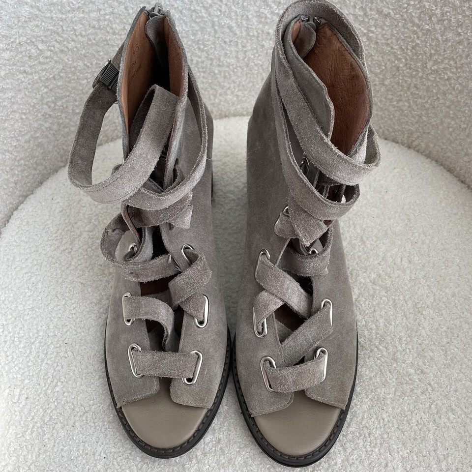 Jeffrey Campbell Salazar lace front block heel booties in a true taupe color. I think the manufactures initial color name for this shoe is gray, but I think it is definitely more tope with some cool tan undertones. Back zip for easy on off and the strap wraps around your ankle and buckles. Open toe. Suede leather