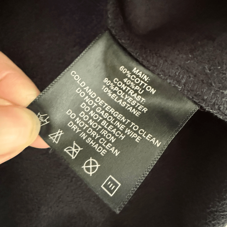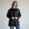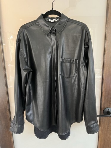 Maniere de Voir faux leather mixed material and embossed long sleeve snap front shirt. The silver snaps are stamped with branding and there is a brand plate at the center back yoke. Smooth fabric on the inside makes for a comfortable fit. This is oversized and measures 30 inches shoulder to hem and 22 inches armpit to armpit. The tag size is eight which in this brand is equivalent to a large. So please double check measurements to ensure the proper fit for you