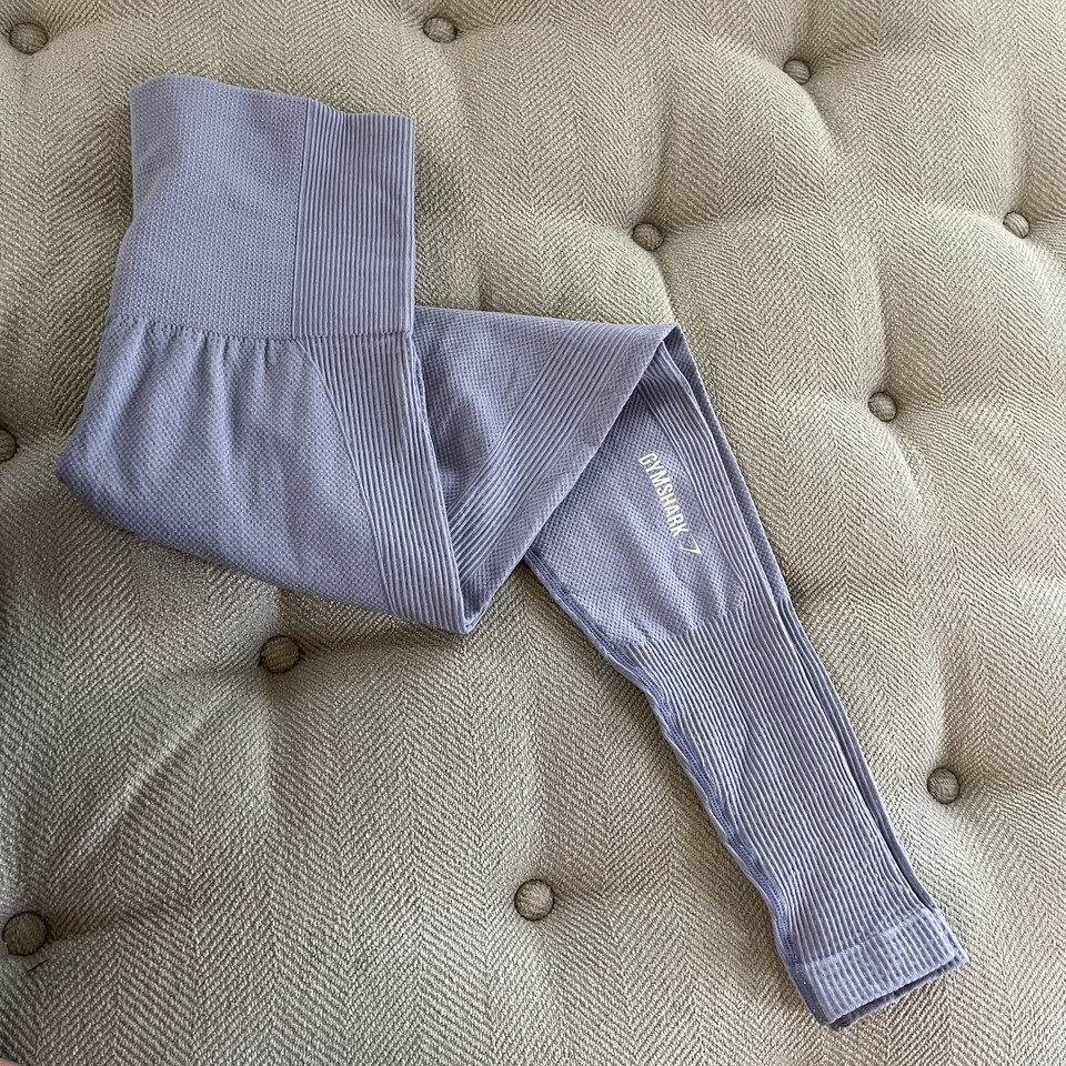 Gymshark lavender seamless high rise compression leggings. 26 inch inseam, 12. 5 inch rise. The color is lavender but the lavender so pale it?s almost gray. Branding down one calf