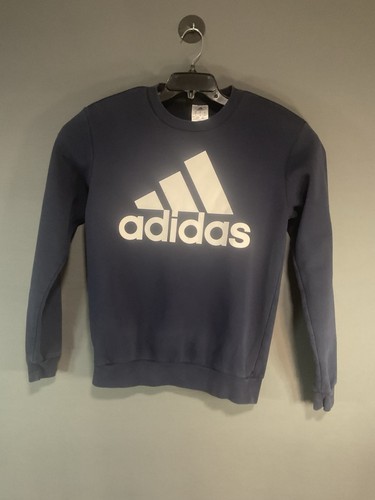 Men?s Adidas crewneck sweatshirt with textured tree foil logo, print large across the front. Cotton and polyester blend. Laying flat measures 24 inches shoulder to ham and 18 inches armpit to armpit. My son removed the size tag because it was bothering him, but this was tag size extra small. Please double check measurements to ensure the proper fit for you. This was barely worn before being outgrown.