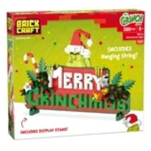 Celebrate the season with a playful twist using the Brickcraft The Grinch Merry Grinchmas Sign Building Kit! This 568-piece set transforms the Grinch?s mischievous holiday spirit into a bold brick-built display piece. The large sign spells out ?Merry Grinchmas? in festive red and green letters, framed by holly leaves, ornaments, and candy canes for added seasonal flair. At the top, the Grinch peeks out in his Santa hat with his signature grin, while brick-built hands clutch the sign as if caught mid-prank. The set includes both a sturdy display stand and a hanging string, giving you the choice to showcase your creation on a wall, table, or mantel. With its vibrant design and holiday personality, this set makes a cheerful decoration and a unique collectible for Grinch fans. A fun build for the season, it?s also a memorable gift that stands out from traditional holiday decor. This collectible display set measures 9.2 in. (23.4 cm) high and 13.9 in. (35.3 cm) wide. Contains 568 pieces.