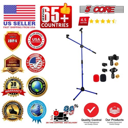 The 5 Core mic stand has adjustable height. The minimum height is 31.5 inches, and the maximum height is 63 inches. The 27 inch boom arm rotates 180 degrees for easy and flexible micpositioning. The tripod leg design features sturdy metal legs with rubber caps, making it stable even on uneven surfaces. The heavy duty mike stand has a strong metal build quality and reinforced clutch, holding up to 3.5 lbs. This floor mic stand comes with 2 mic holders and 3/8" to 5/8" screw adapters, fitting most mics and accessories. Portable soporte de microfono, collapsible design, and can be assembled in minutes. Perfect for anyone who needs a reliable, versatile mic stand.