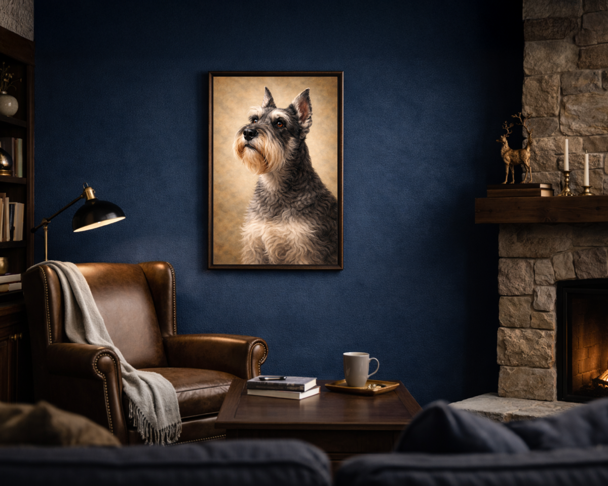 Designed for Schnauzer owners and dog lovers, this refined portrait blends beautifully into farmhouse, rustic, traditional, or cozy interiors. Whether displayed in a living room, office, or gifted to a devoted pet parent, this artwork brings warmth and personality to any space.