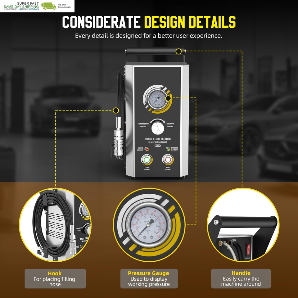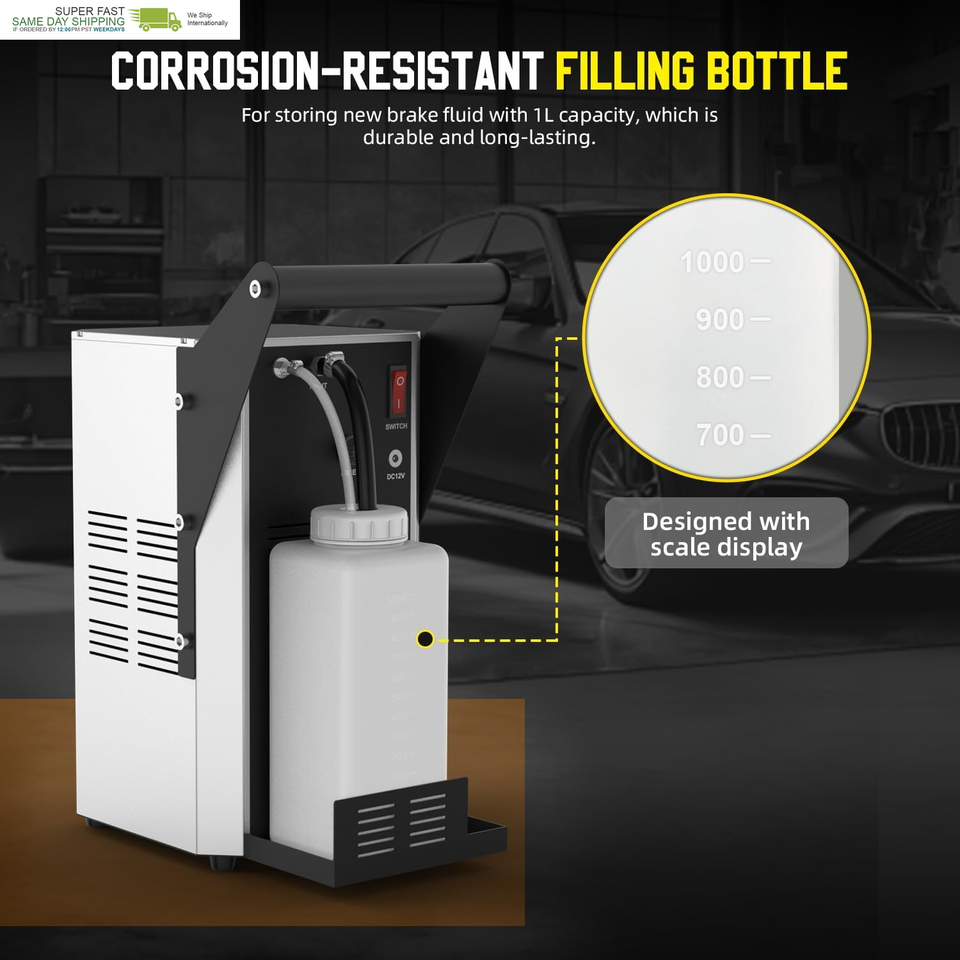 ?Fluid Shortage Protection Friendly design?Fluid Shortage Protection,When the new brake fluid container is empty during filling, vacuum brake bleeder will automatically stop working to prevent air from entering the car brake fluid container. Handle,Easily carry the machine around;Pressure Gauge,used to display working pressure;Hook, For placing filling hose. Corrosion-resistant filling bottle with 1L capacity, which is durable and long-lasting.
