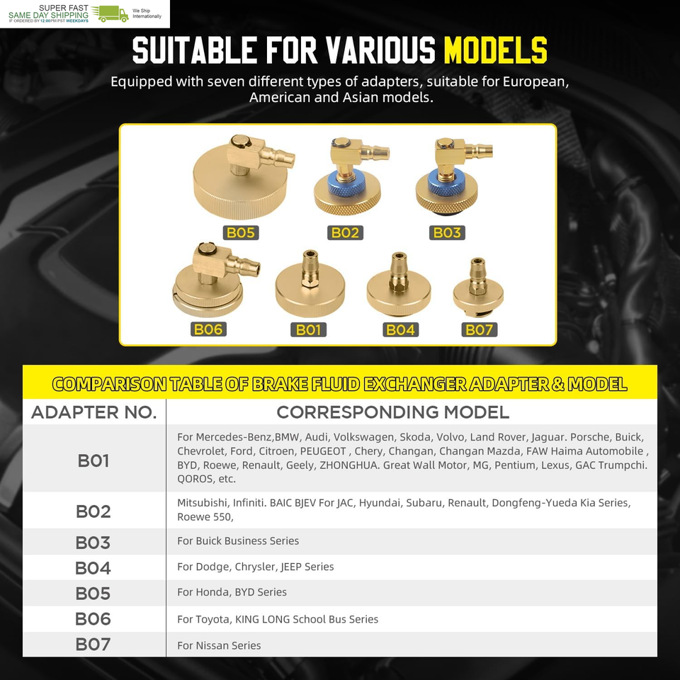 ?Pressure Detection 7 Adapters?Brake bleeder kit has a built-in working pressure pump, no need for an external vacuum pump. It also has a built-in pressure monitoring device. If pressure cannot be built up or the pump sucks in air, the pump will automatically shut down, preventing air from being injected into the vehicle brake fluid reservoir. The Automatic Brake Bleeder Kit Equipped with seven different types of adapters, suitable for European.American and Asian models.