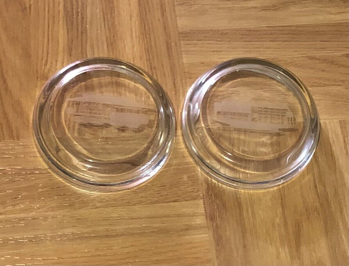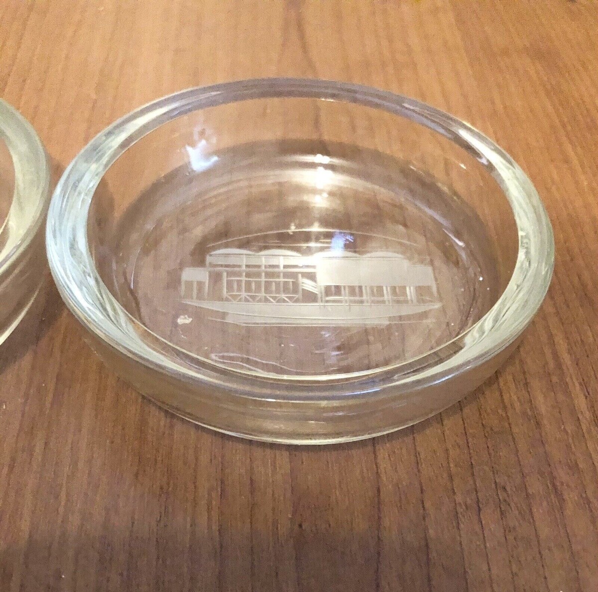 No chips or dents. Has a building design on the bottom of each glass ashtray. Each tray has a diameter of 3 3/4" (almost 4"). Can be used for a pet dish, coins, candy or anything your imagination can conjure up.