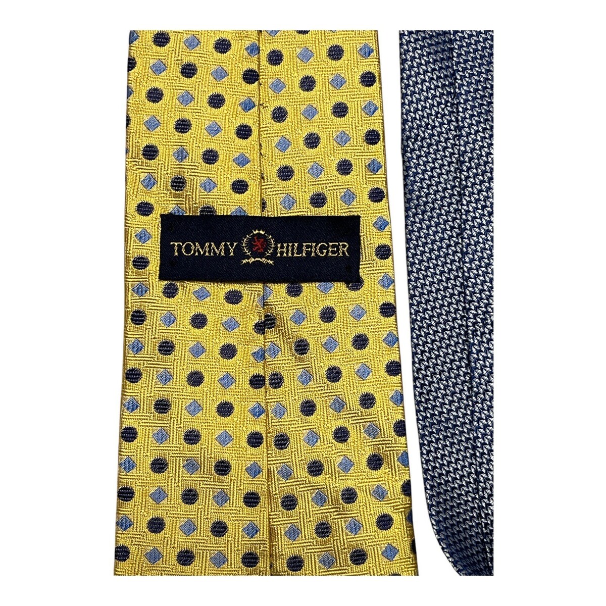 Vintage Tommy Hilfiger men?s silk necktie in a bold yellow tone with navy and light blue geometric dot pattern. Features a classic pointed blade and a contrasting textured blue reverse and tail, adding visual interest and depth. A well-made designer tie that reflects late-20th-century American menswear style, ideal for collectors or for elevating modern suits with a vintage accent.