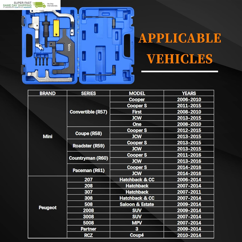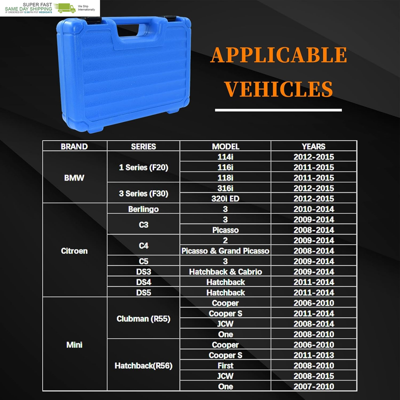 Timing Tool Set compatible with BMW MINI models equipped with N12, N13, N14, N16, and N18 engines, as well as Citroen C4 and Peugeot models with 1.4L, 1.6L, or 1.6T 16-valve petrol engines. Suitable for BMW 1 Series (114i, 116i, 118i), BMW 3 Series (316i, 320i), MINI Clubman (Cooper S R55, JCW R55), Countryman (Cooper/Cooper S R60, JCW R60), Coupe (Cooper S/JCW R58), MINI Hatch (Cooper S R56/R87), Paceman (Cooper/JCW R61), and Roadster (Cooper S/JCW R59).