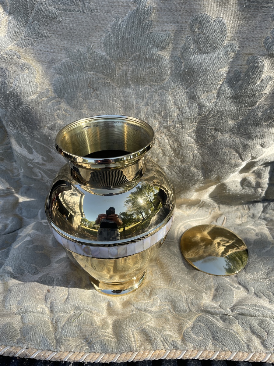 Solid brass handmade with Mother of Pearl inlay. Large Adult urn for ashes .