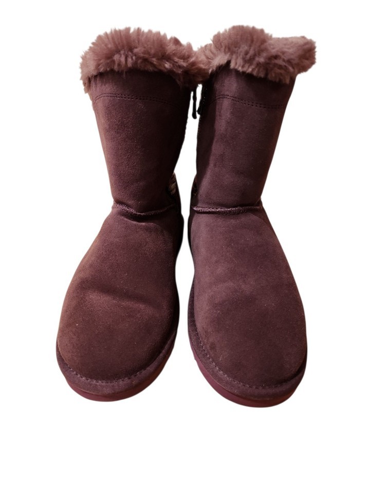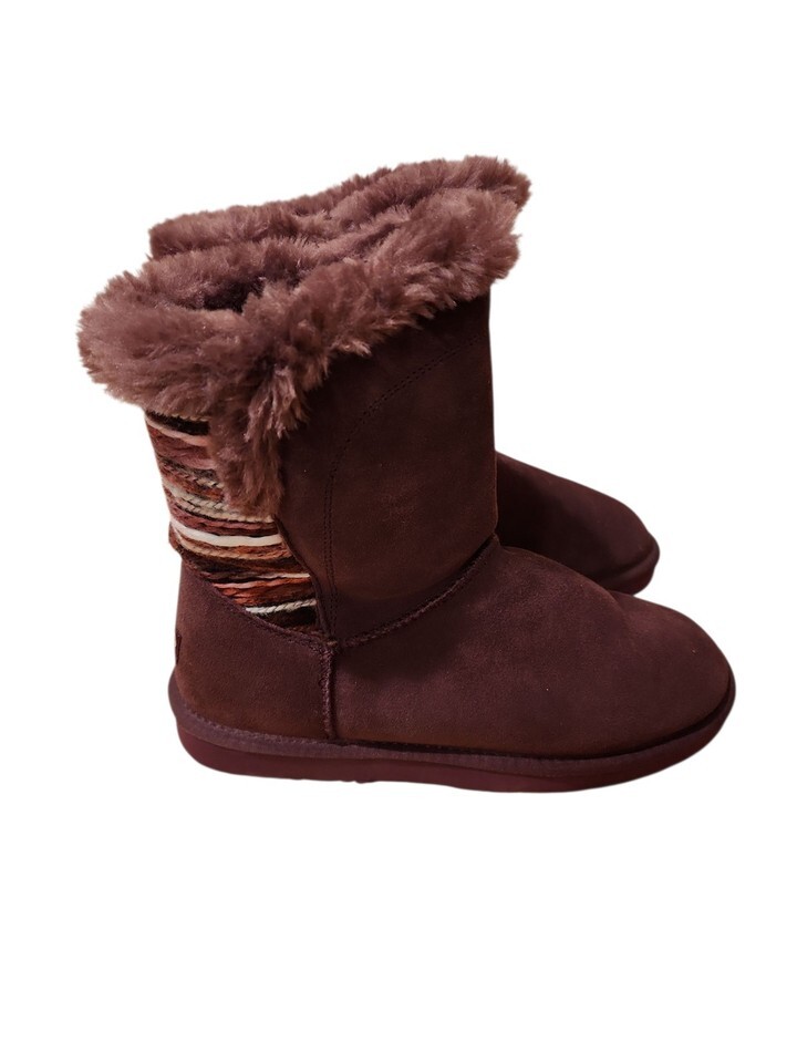 Keywords: Lamo boots, womens boots, faux fur boots, winter boots, brown boots, knit accent boots, pull on boots, casual boots, cozy boots, warm boots, suede boots, ankle boots