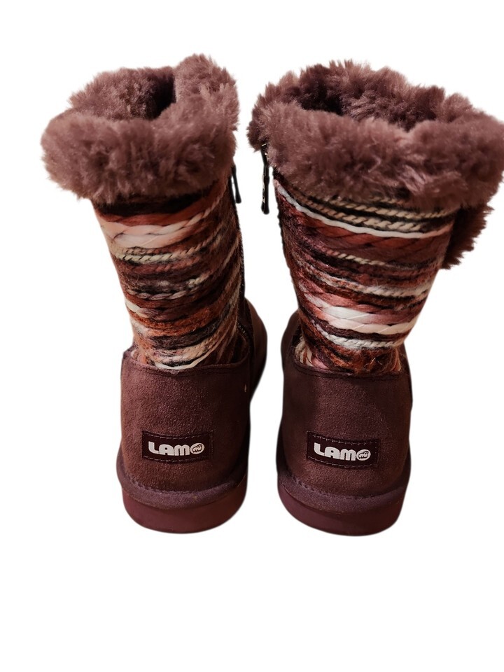Embrace cozy comfort with these stylish Lamo boots. A rich brown hue envelops the soft exterior, complemented by a plush faux fur trim that peeks out from the top, promising warmth and a touch of luxury. The back of the boot features a unique knit accent in a blend of earthy tones, adding a pop of visual interest. Designed for easy wear, these pull-on boots are perfect for keeping your feet snug on chilly days. Ideal for casual outings, apres-ski relaxation, or simply lounging at home.
