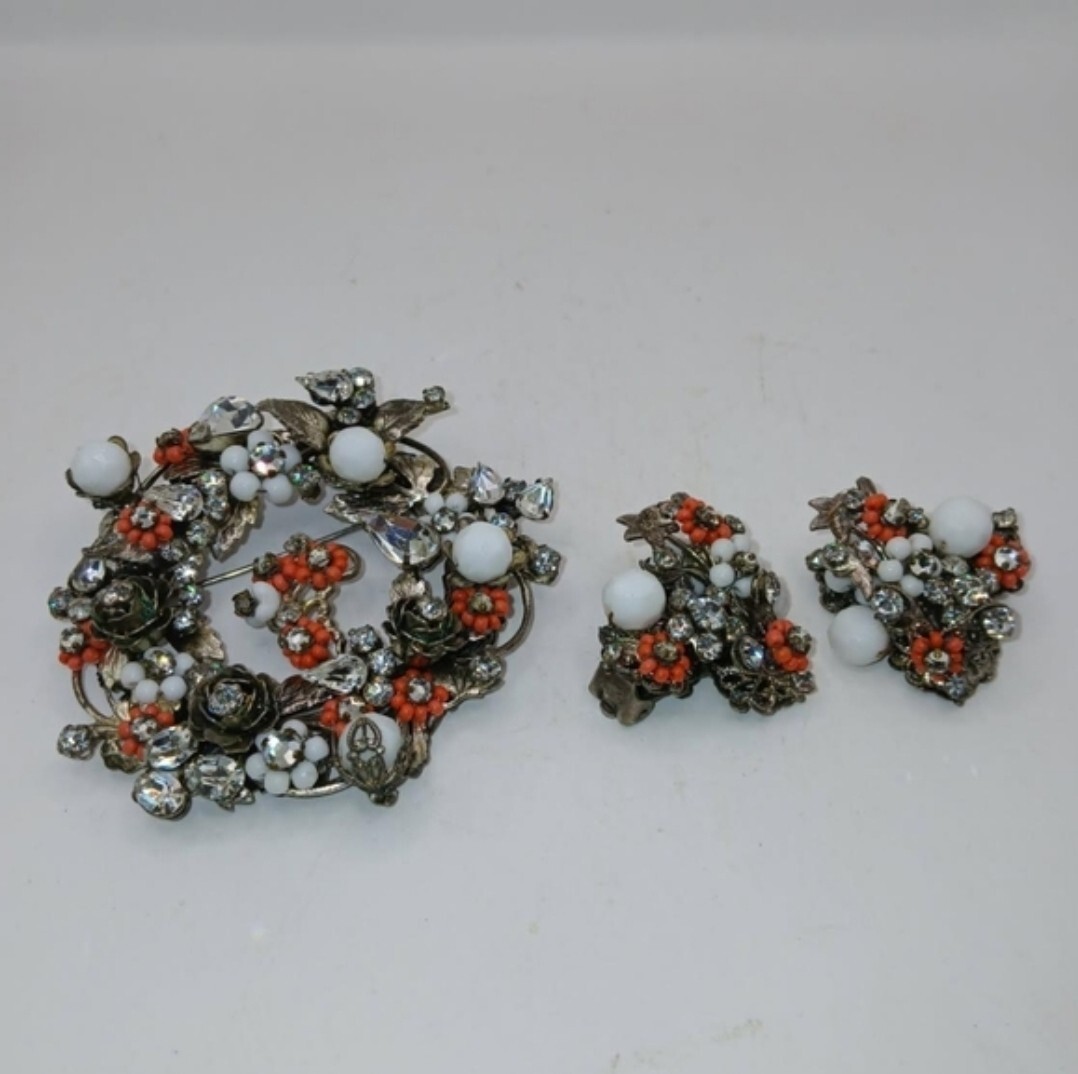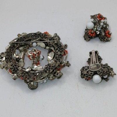 Unsigned Miriam Haskell brooch and clip on earrings