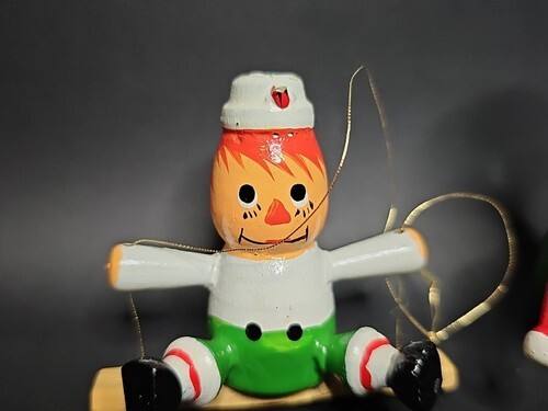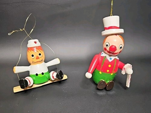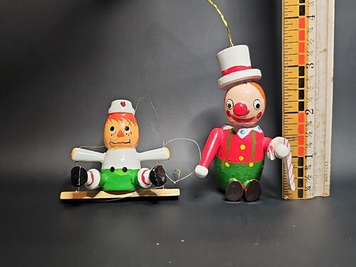 UP FOR SALE: Vintage Handcrafted Set of 2 Clowns Wooden Christmas Hanging Ornaments