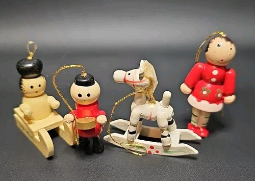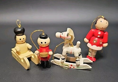 Vintage Lot of Wooden Christmas Ornaments 4 Hand Painted People Rocking Horse