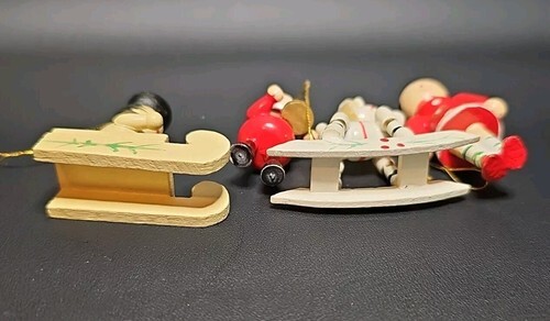 UP FOR SALE: Vintage Lot of Wooden Christmas Ornaments 4 Hand Painted People Rocking Horse