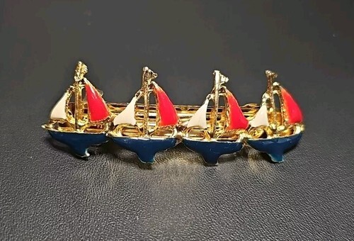 Vintage Enamel Sailing Ships Blue Red and Goldtone Hair Clip Barrette
