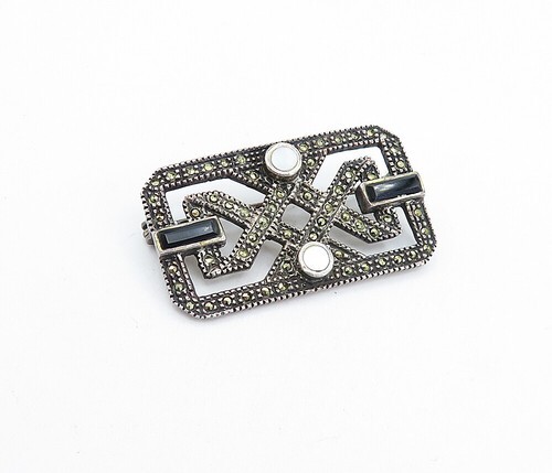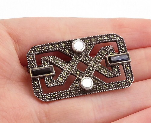 925 Sterling Silver Vintage Mother Of Pearl & Black Onyx Brooch Pin BP2331