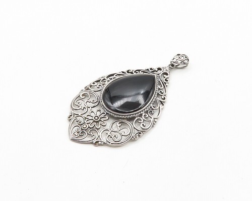 925 Sterling Silver Vintage Black Onyx Floral Baroque Swirl Pendant PT15438