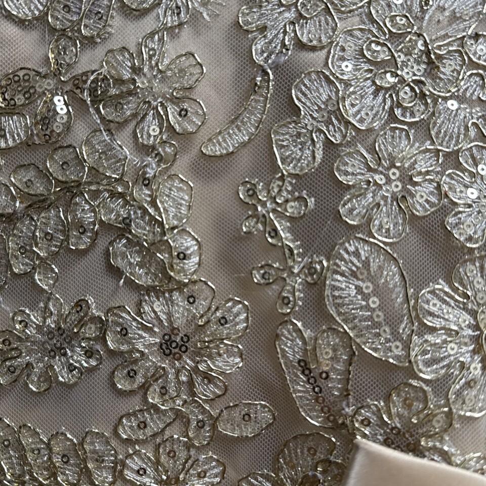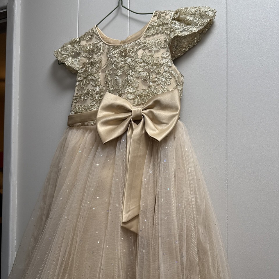 This gold sequin daddy daughter dance pageant bridesmaid flower girl dress in size 5/6 is a beautiful and elegant option for young girls attending formal occasions like weddings. The dress features a stunning gold color with sequin detailing, adding a touch of sparkle and glamour. Multiple layers. Removable bows. Beautiful princess ball gown.