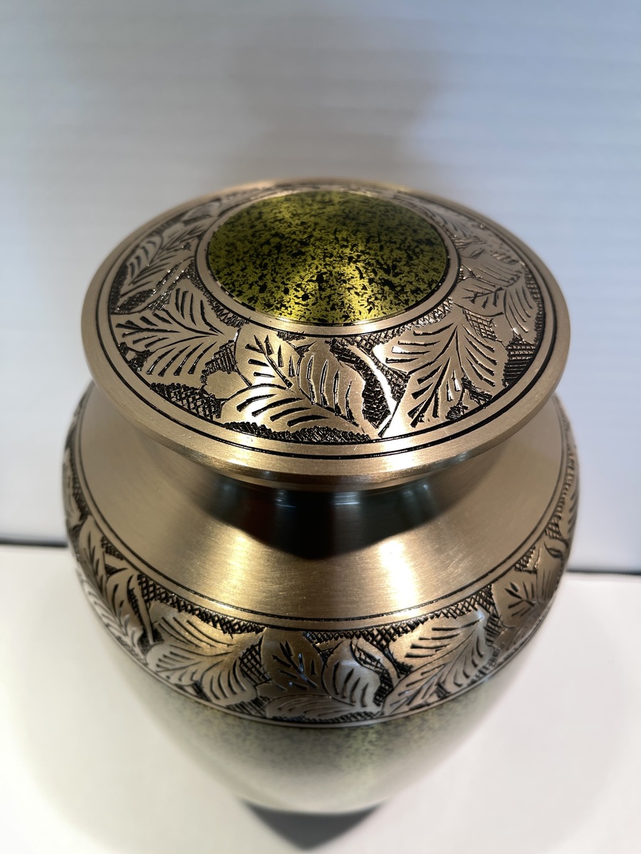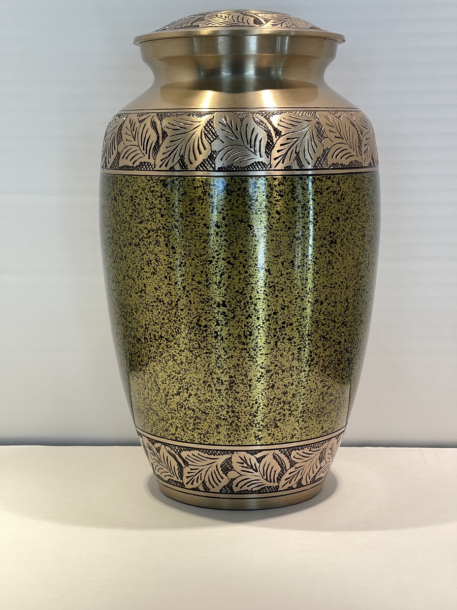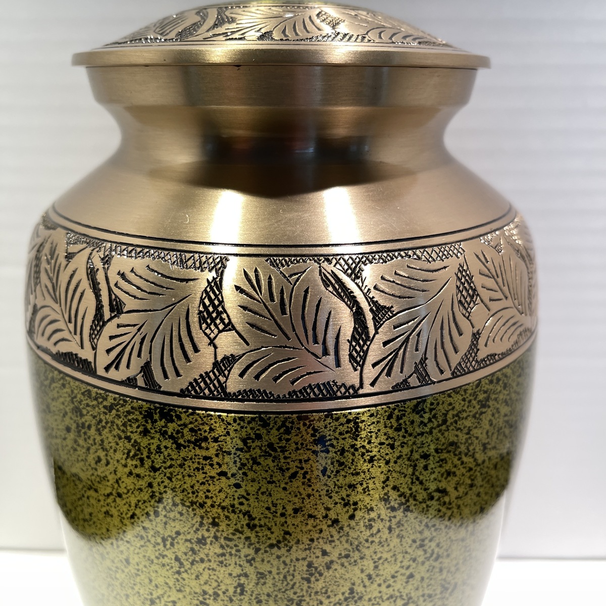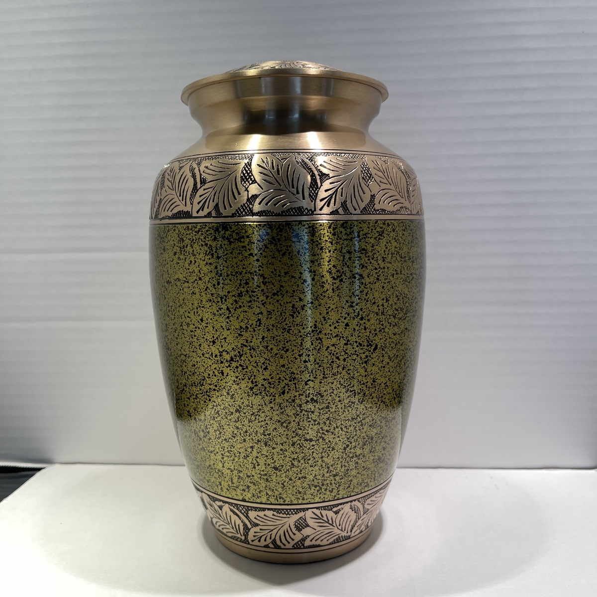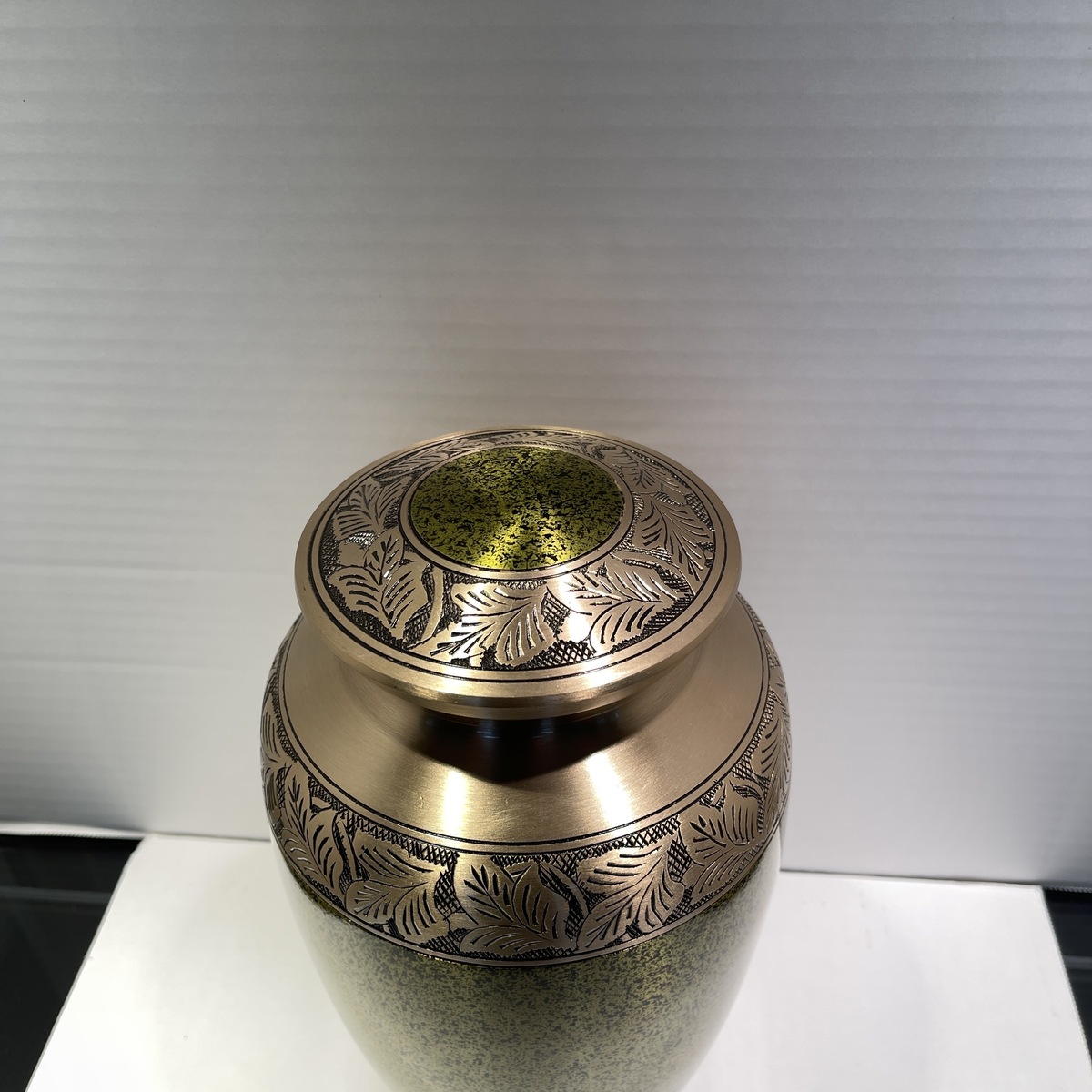 Olive Lacquer Spotted Brass Urn Adult Large Etched Foliage