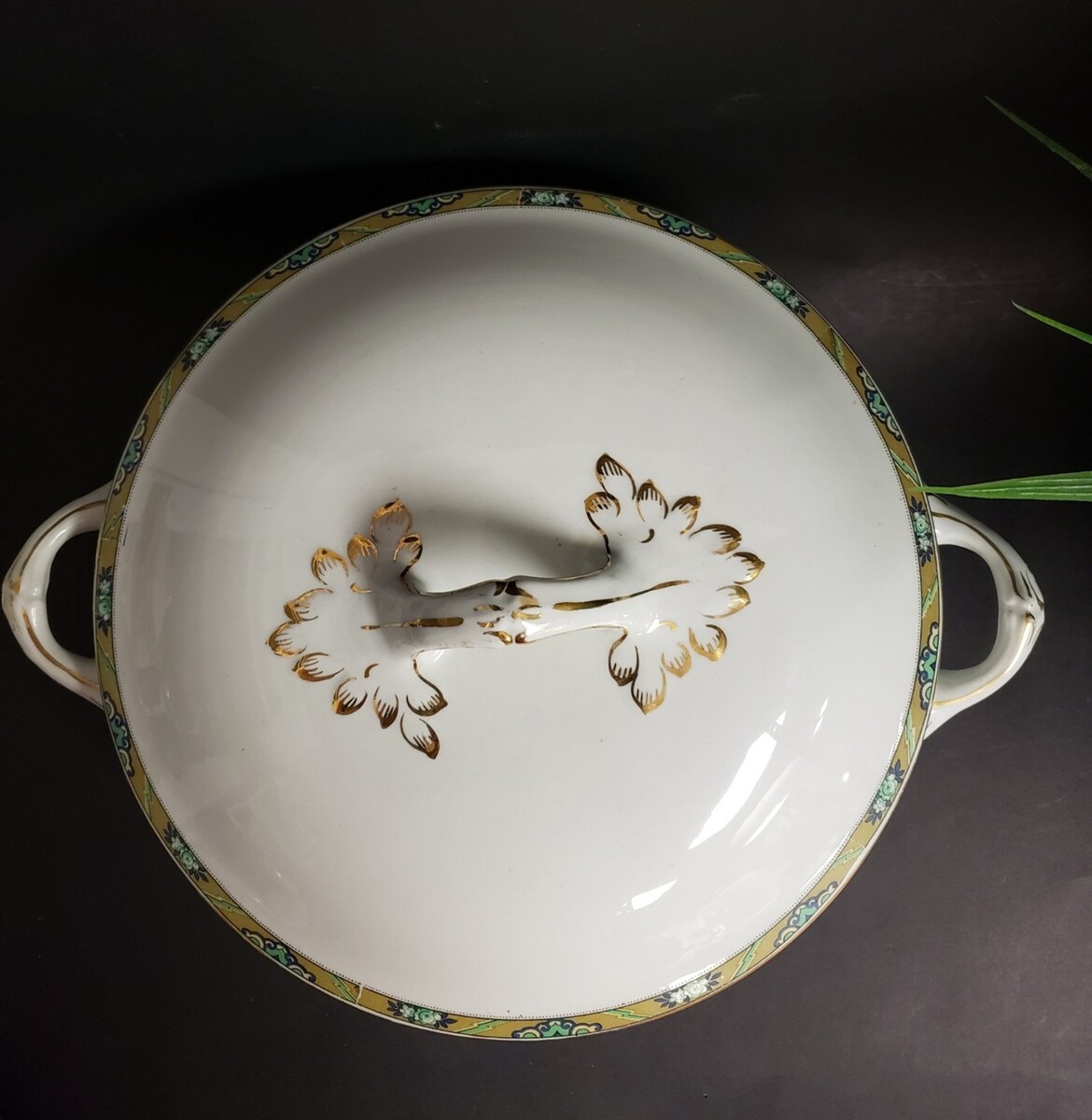 It features a distinctive green and blue floral-scroll border and hand painted gold trim