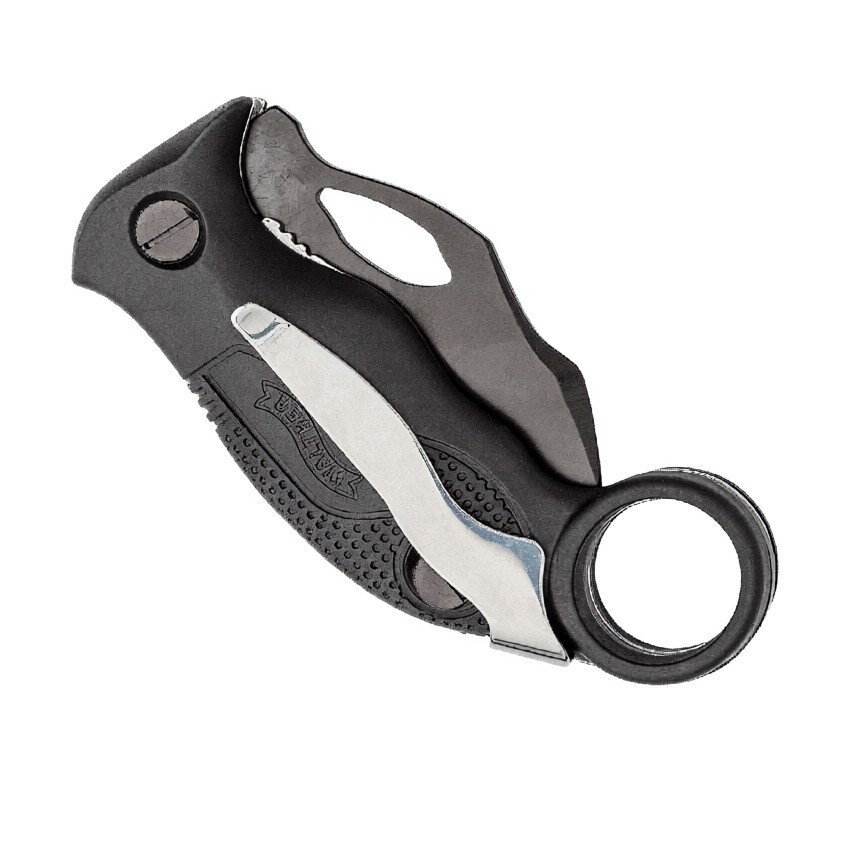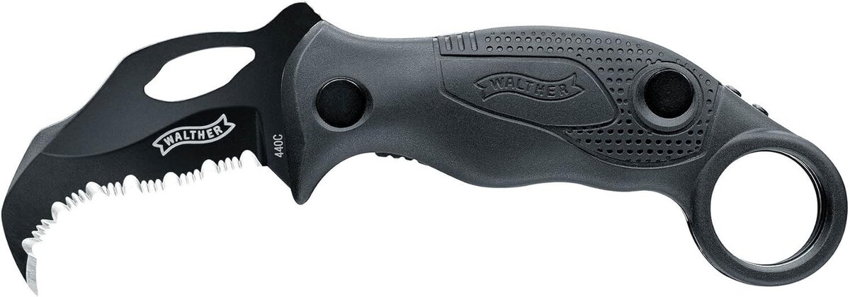 Add a compact, aggressive-curved Walther KDK Karambit Defense Knife to your EDC or gear bag. This folding karambit features a black serrated hawkbill blade made from 440C stainless steel for strong corrosion resistance and a sharp working edge. A finger-ring pommel helps with retention and handling, and it includes a black nylon sheath/pouch for convenient carry and storage.