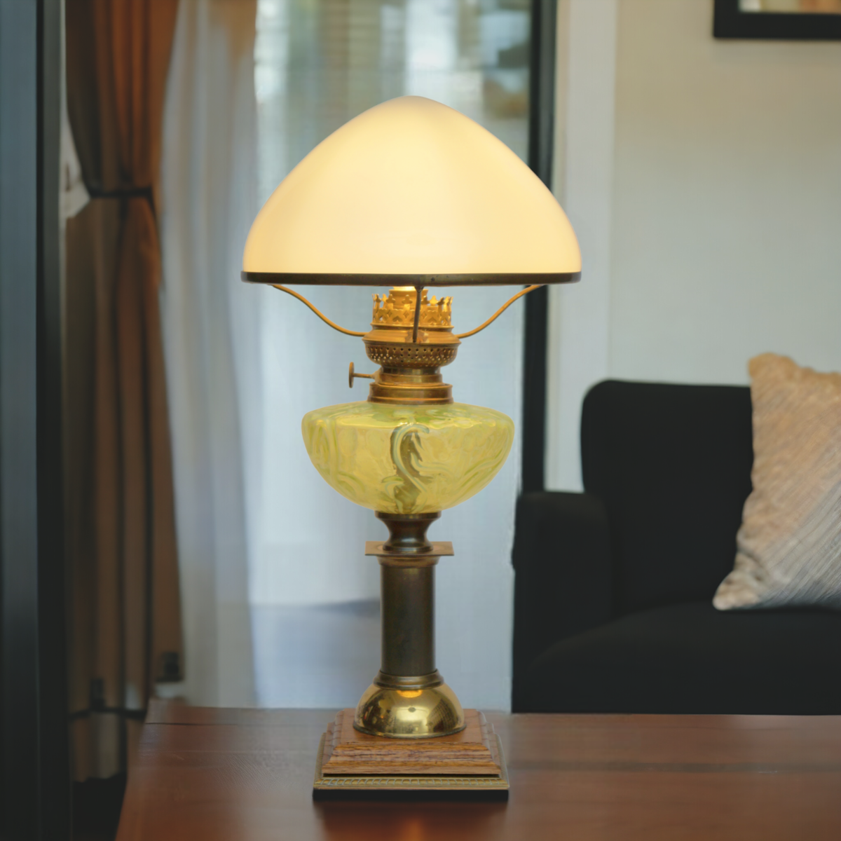 Original Art Nouveau table lamp "LANCASTER" based on an antique petroleum lamp.