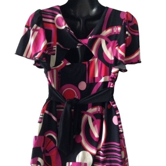 New without tags. Soft and clean. See photos for details. This vibrant top combines bold geometric prints with a flattering silhouette. The belted waist and flutter sleeves enhance your figure, while the keyhole neckline adds a modern touch. Crafted with a stretch fabric blend for comfort and style, it's a versatile piece for day or evening wear.