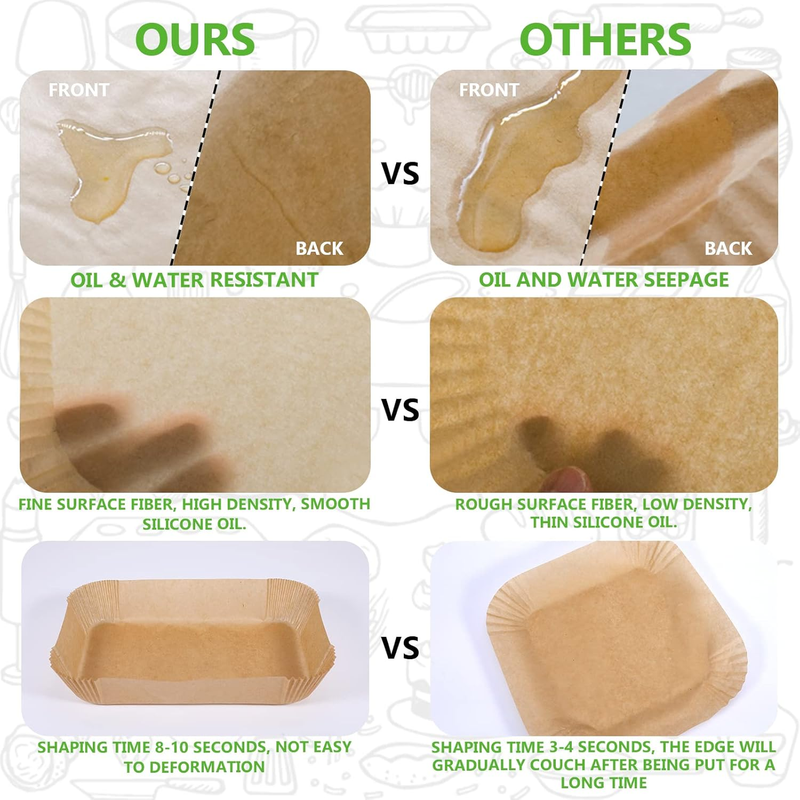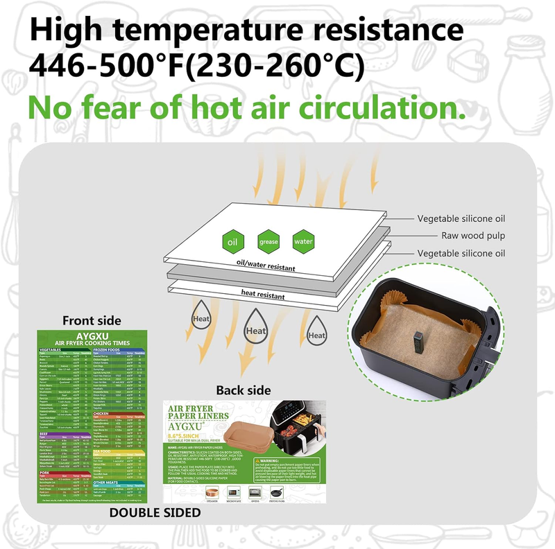 The baking paper is made of food-grade double-sided silicone paper with vegetable silicone oil paired with virgin wood pulp. The air fryer liner is waterproof, oil-resistant, non-stick, and has good heat resistance and can withstand temperatures of up to 446-500 degrees Fahrenheit. And it has no effect on the flavor of the food.